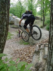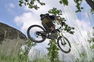 Fatto qualche saltino all’ombra del Ponte il giro prosegue con una prima discesa chiama “il Toboga”, tutta da guidare in velocità e piena di sponde… dai commenti al termine della discesa in zona “Brandola” mi è sembrato che sia stata apprezzata dai nostri ospiti. Siamo poi risaliti velocemente per una carraia immersa nel bosco fino ad una casa diroccata. Da qui inizia la seconda discesa “la tecnica”, una delle mie preferite in zona! Anche se un pò sporca rimane molto divertente dove, con un pò di fantasia, si riescono a individuare linee sempre diverse, in puro stile freeride. Purtroppo, tornati a Brandola, si deve intraprendere la salita fatta in precedenza per ritornare al Ponte. Durante la salita si sento numerosi tuoni in lontananza e alcune nubi minacciose si stanno spostando nella nostra direzione. La giornata non poteva proseguire senza intoppi e infatti dopo pochi minuti dai primi tuoni inizia a piovere a dirotto. Tornati al Ponte ci proteggiamo dall’acqua sotto l’imponente arco di roccia. Qui purtroppo la mitica Lisa ci deve abbandonare per un impegno, mentre noi decidiamo di aspettare che il tempo migliori leggermente per poi affrontare l’ultima discesa. Il tempo non ci concede tregua e quindi, dopo esserci imbacuccati per bene, ci dirigiamo verso la discesa che ci porterà ai piedi del paese di Monzone. Incuranti del acqua, sia quella proveniente dal cielo che quella accumulata lungo il sentiero in giga pozze mortali, proseguiamo nella nostra marcia quando anche Kevin ci abbandona… essendo idrosolubile ha pensato bene di tornare velocemente alla macchina.