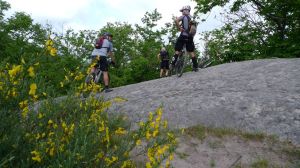 Decidiamo per un classico giro del Diavolo con tre risalite e tre discese partendo da Monzone, difronte all’agriturismo “Casa Minelli”. La salita su carraia ci porta velocemente al famoso “ponte del Diavolo”, un monolite naturale che unisce i fianchi di un avvallamento.