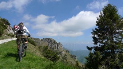 Raggiungiamo così il crinale e puntiamo verso la malga Tombea in leggera discesa, dove ci aspetta un tratto non ciclabile stronca gambe fino alla vetta del nostro giro, Monte Tombea, quota 1950 metri. La faticaccia e la stanchezza vengono spazzati via dalla bellezza del paesaggio che si gode dal monte, peccato solo dalla leggera foschia che limita l’immensità del panorama.