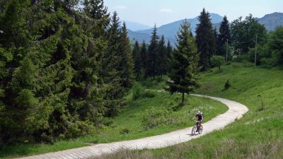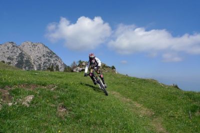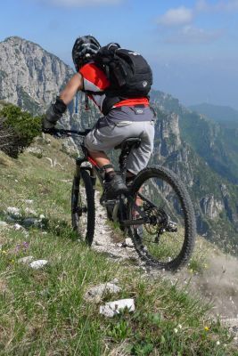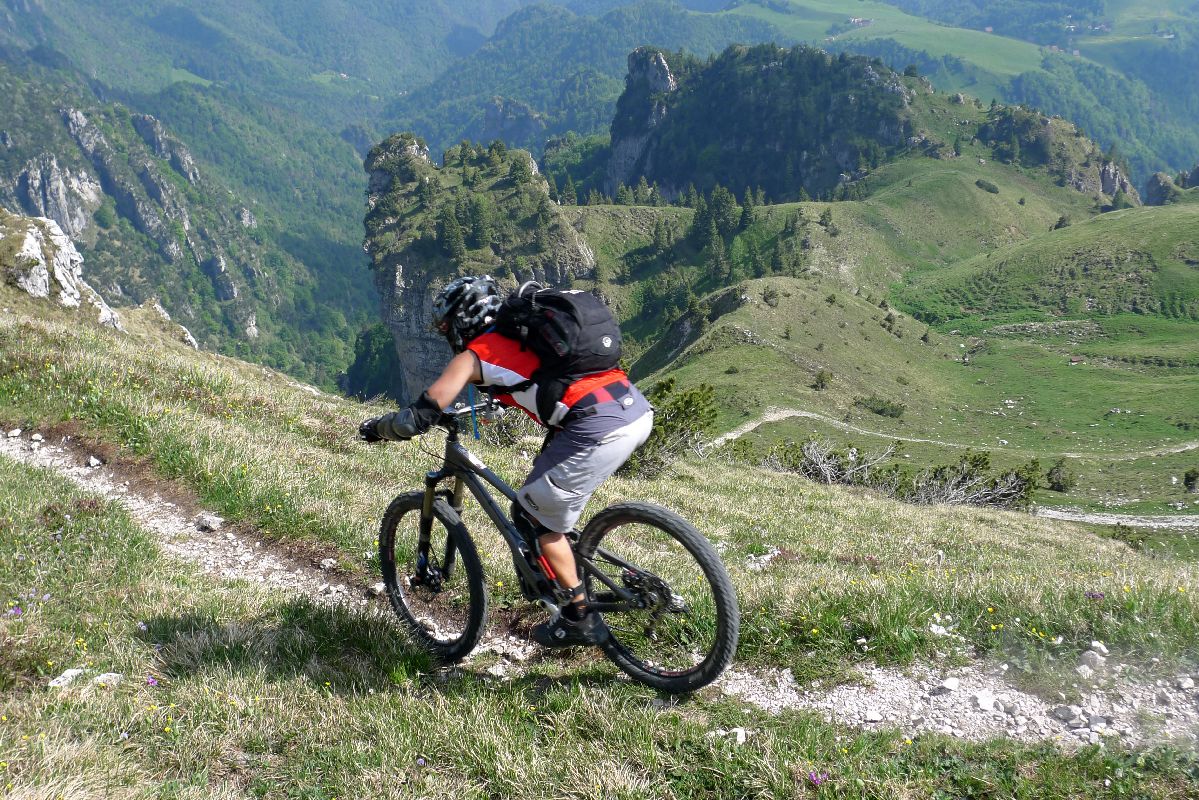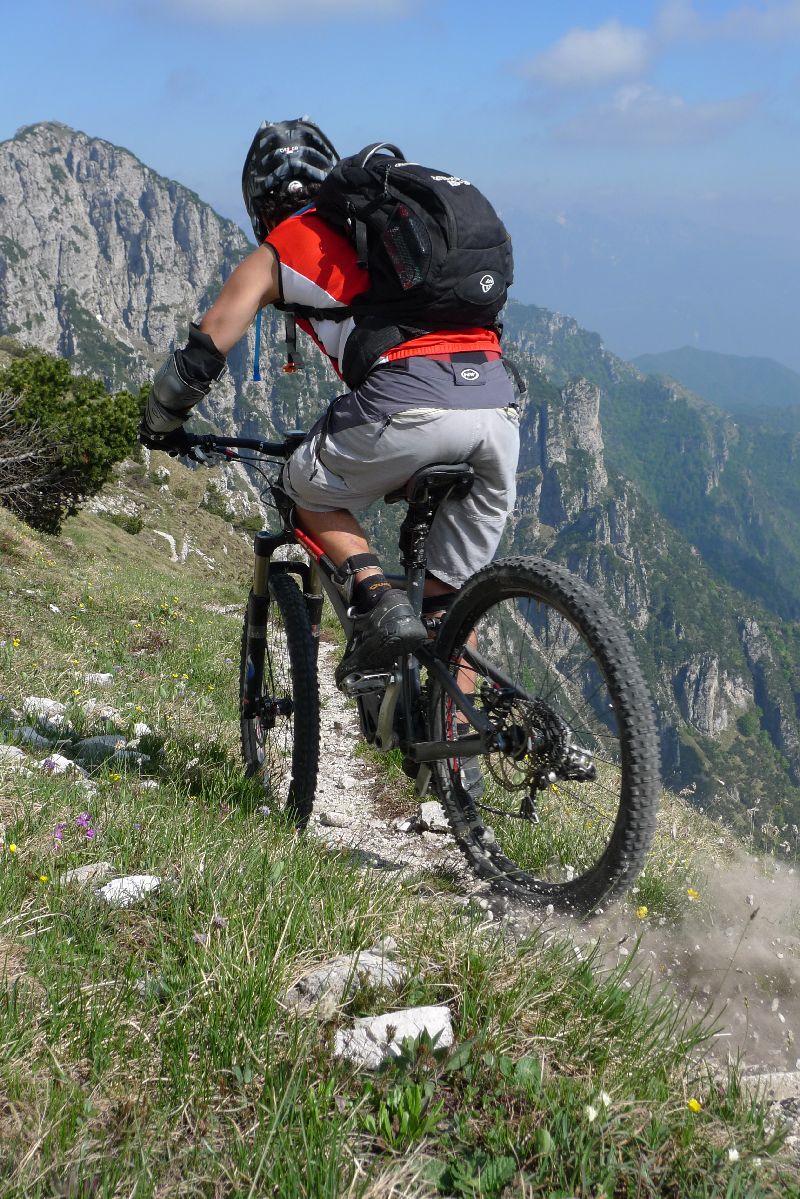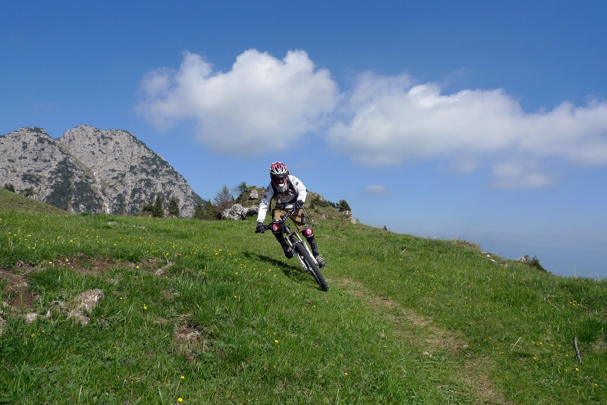 Una volta bardati con protezioni e caschi cominciamo a scendere per il sentiero fatto in salita fino alla malga, il panorama è da mozzare il fiato e il sentiero scorre veloce senza grosse difficoltà una curvetta dopo l’altra… Spettacolare!