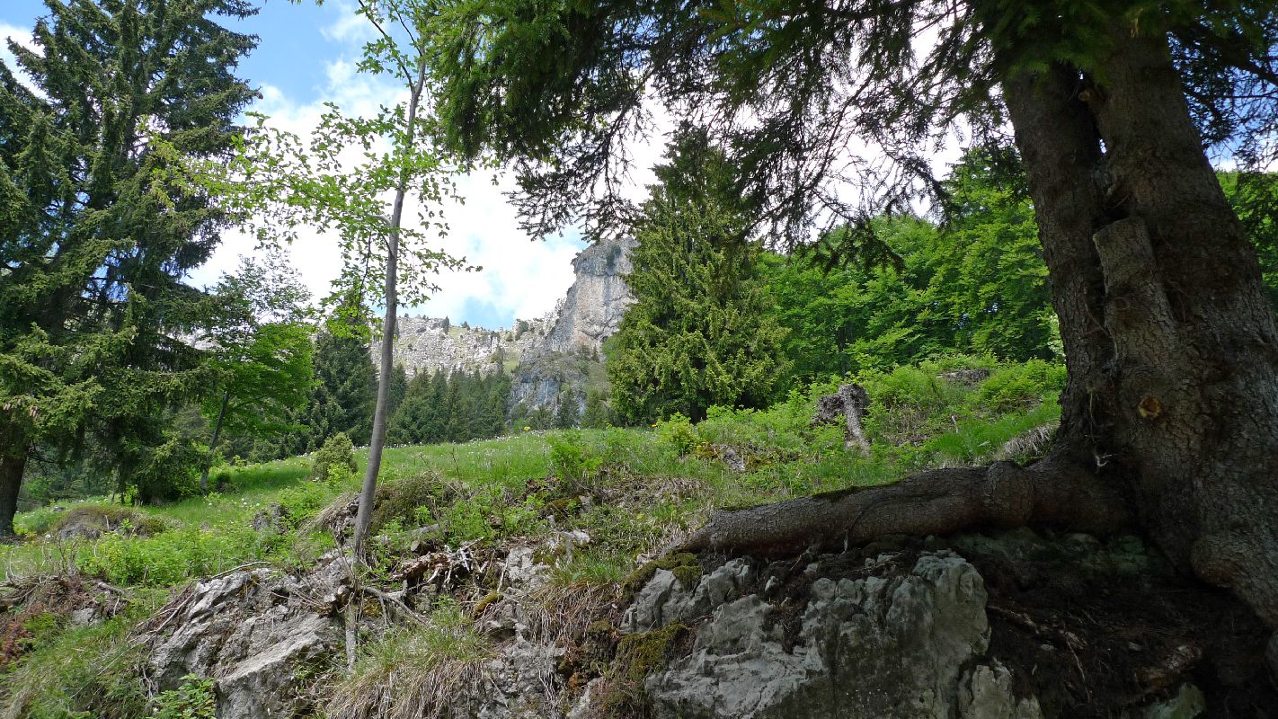 Il buon Renky paga lo scarso allenamento della stagione rimanendo sempre più distante, ma sembra determinato a completare il giro. Usciti dal bosco, la sterrata prosegue immersa in prati aperti dove numerose stalle con tetto di paglia e le vette che ci circondano ci fanno pensare alle Dolomiti… cominciamo a intravedere i “paesaggi da favola” promessi dal malefico Milzo.