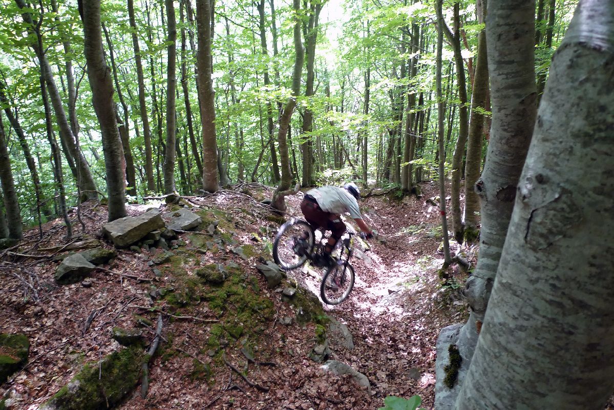 Il divertimento sempre ai massimi livelli ha raggiunto l’apice sul sentiero 1, quando il grande Manu ha aperto il gas e ci siamo lanciati senza che ci fosse un domani. Il sentiero è decisamente il mio preferito, con un’alternanza di pezzi guidati e tecnici su rocce, esaltante come nessun altro.
