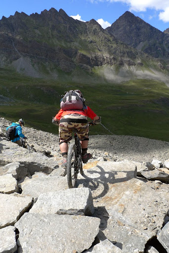 Adesso i giochi si fanno seri e la salita comincia a tirare decisamente. Siamo in una vallata di origine glaciale dove le rocce regnano sovrane. Il sentiero non sempre ciclabile ci fa guadagnare dislivello velocemente. Intanto cominciamo a scorgere la nostra meta, il Colle Lauson. La salita finale al colle è terrificante da vedere, un muro quasi strapiombante.