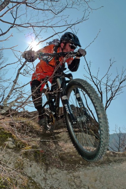 Qui troviamo due escursionisti un pò attempati che ci attaccano una pezza stratosferica. In qualche modo ci liberiamo dal gancio mortale e ci prepariamo alla discesa. Partiamo alla grande, il sentiero è decisamente stile “Romagna che incanta”, tutto da guidare e tecnico al punto giusto, semplicemente una libidine.