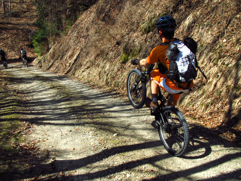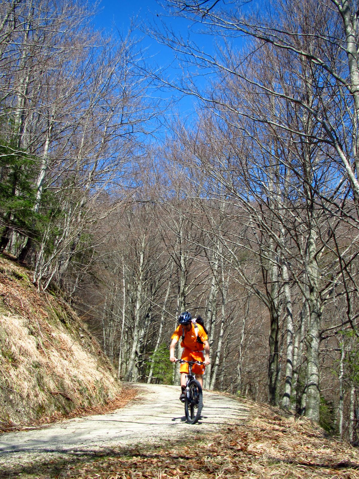 Arriviamo a Fiumicello belli gasati e ci godiamo una meritata sosta rifocillandoci a dovere. Si torna purtroppo a salire su asfalto in direzione del “passo della Braccina”. Arrivati, la fatica si fa decisamente sentire e indovina chi ci ribecchiamo? i due chiacchieroni, aiutooooo… non finiscono mai di parlare! Finalmente riusciamo ancora a fuggire e ci gettiamo nella seconda discesa. Anche questa è molto bella anche se discontinua, gli strapponi in salita non sono una cosa gradita quando si è tutti bardati con la sella bassa.