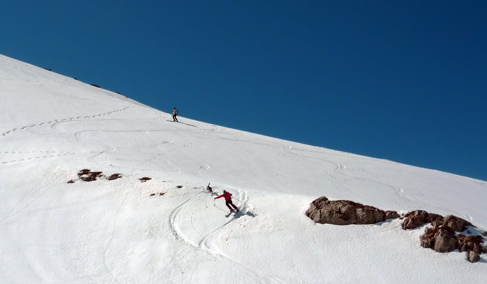 Il pendio è immacolato, con la pendenza giusta. Ho paura che ci si divertirà parecchio… semplicemente da sbavo infatti! Ahhhhh ancoraaa! però le gambe sono completamente fuori uso. Mi devo accontentare per oggi. Altrimenti dovranno recuperarmi in barella a fine giornata.
