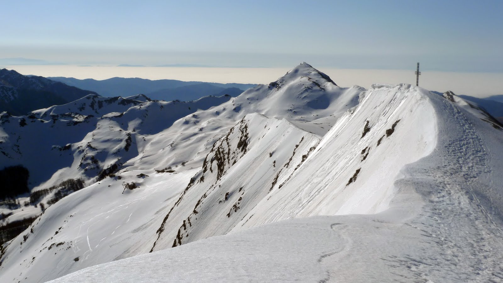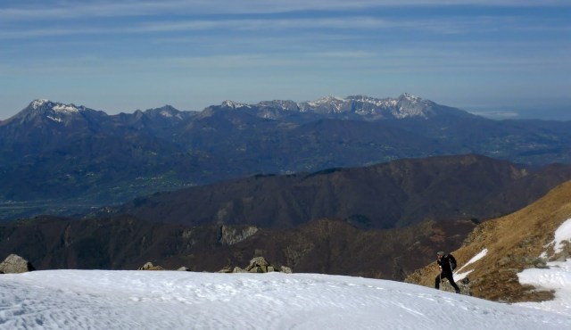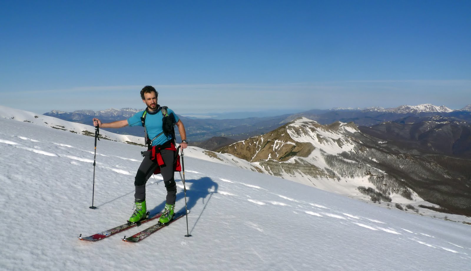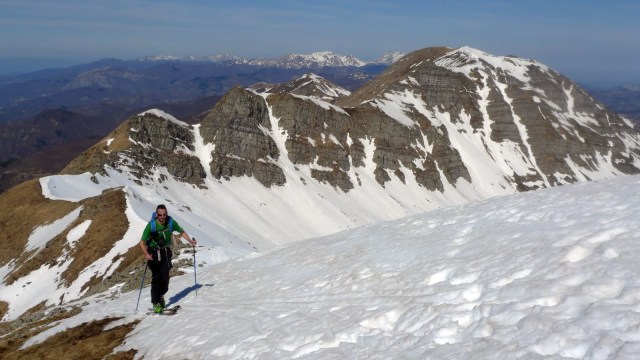 Chiusa la parentesi “poetica” torniamo alla gita. Per l’ultimo tratto della salita, poco prima di raggiungere la cresta, montiamo i coltelli. Qui la neve è ancora bella dura, ottimo, ci rassicura per l’imminente discesa. Stefano mi spiega che la vera vetta del Giovo non coincide con la posizione della croce, ma si trova spostata verso ovest, la cima più alta, ma decisamente meno spettacolare. Il panorama è come sempre incredibile, il Cimone è a due passi, un pò spelacchiato a dir la verità! Ho paura che la sud del Cimone non sia più fattibile… peccato, quest’anno non sono riuscito a farla neanche una volta!