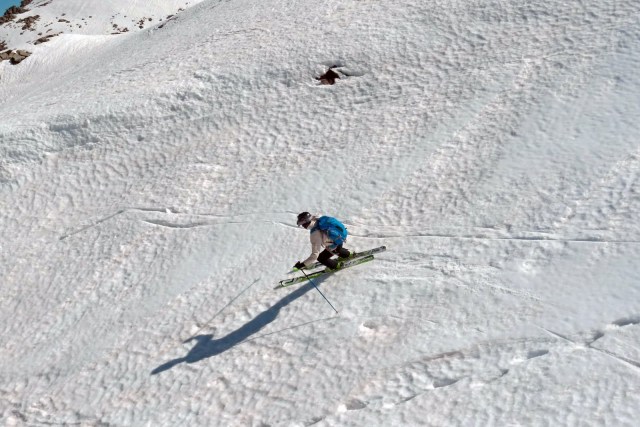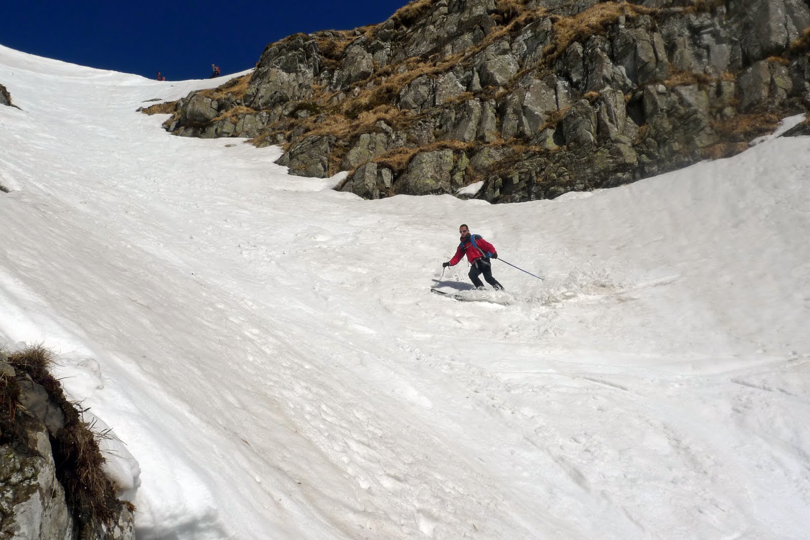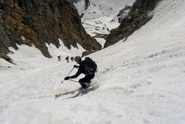 Facciamo un piccolo tratto di crinale con gli sci in spalla e raggiungiamo l’imbocco al primo canale del triangolo. Purtroppo la neve è bella papposa, come previsto l’esposizione al sole non ci ha aiutato. Stefano è un pò indeciso, per circa 5 millisecondi, poi parte senza indugi. La sua anima da garista ha il sopravvento, chi si ferma è perduto! Ci lanciamo tutti nel canalino, sembra di surfare, la neve scorre sotto di noi, un torrentello in miniatura. L’emozione è tanta, il lago Baccio sembra lontano un miglio. Tra un saltello e l’altro, trascinati un pò dalla corrente della neve, raggiungiamo l’uscita.