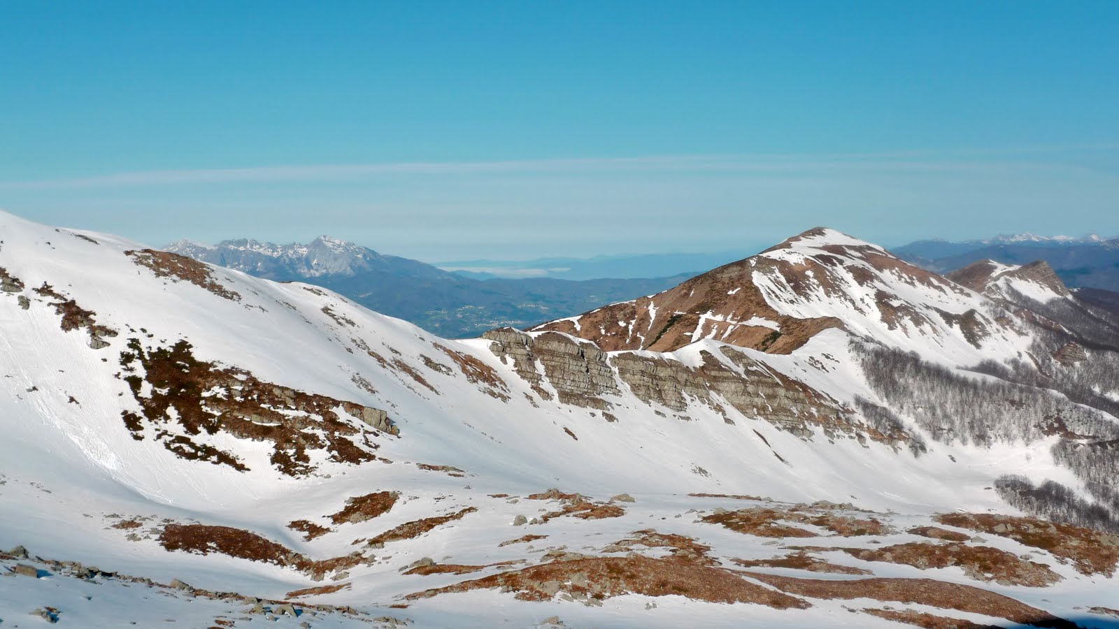 Manteniamo la destra del vallone, l’idea iniziale era quella di salire sul Rondinaio Lombardo. Piccola digressione… il nostro cicerone Stefano ci chiede se conosciamo l’origine del termine “Lombardo”; alla nostra ovvia risposta negativa ci spiega che deriva dalla considerazione che avevano tutti i Toscani per i popoli al di là degli appennini, definiti tutti come “lombardi”. Sarà vero? maaaaa! Facciamo finta di crederci. Visto la condizione della neve però preferiamo ritornare sulla cresta tra il Rondinaio e il Giovo. Intanto Dave comincia a mostrare i primi segni di cedimento, evidentemente la partita a calcio del giorno prima ha fiaccato anche un TOP come lui. Il nostro eroe però non demorde e ci raggiunge per l’ultima discesa.