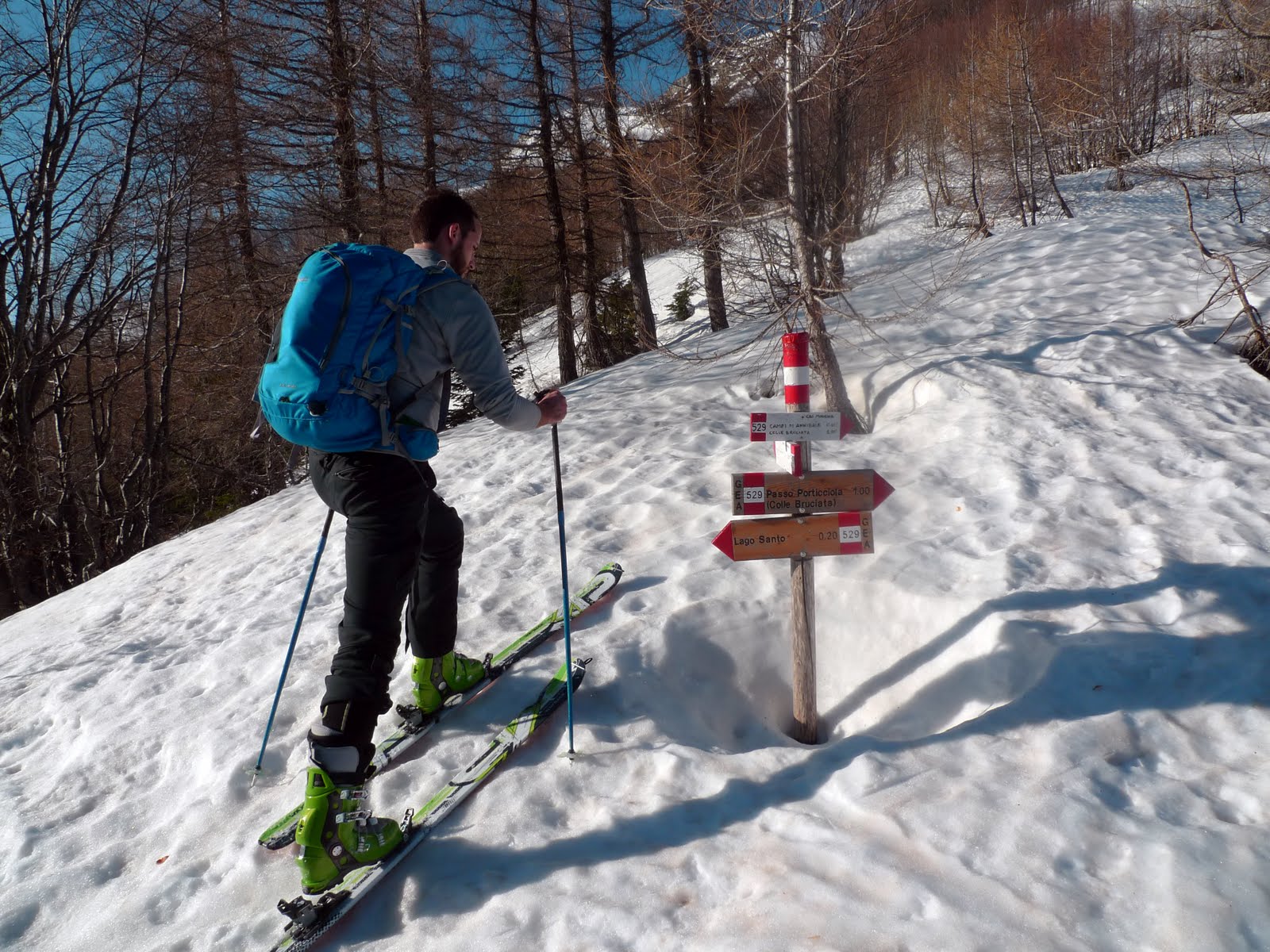 Per le 8 siamo tutti pronti al Lago Santo, manca solo Spalla che ci raggiungerà più tardi al termine della prima discesa. Per fortuna la neve non manca e possiamo tranquillamente partire con gli sci ai piedi. Arriviamo al Lago Santo e decidiamo per la più comoda e graduale salita dal vallone delle Fontanacce.