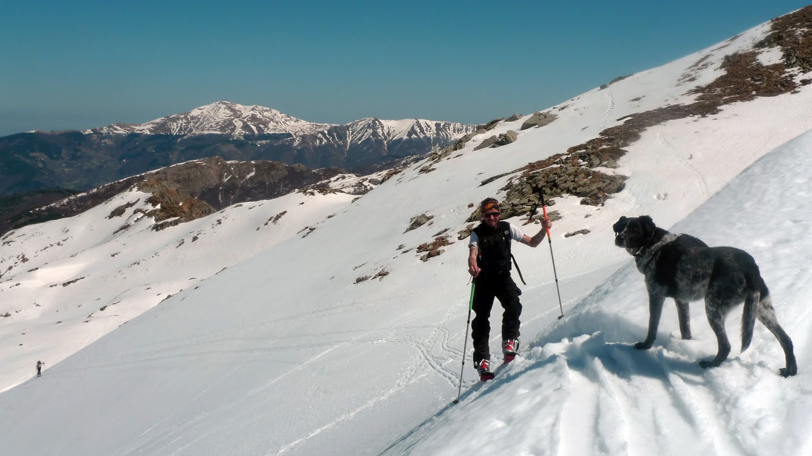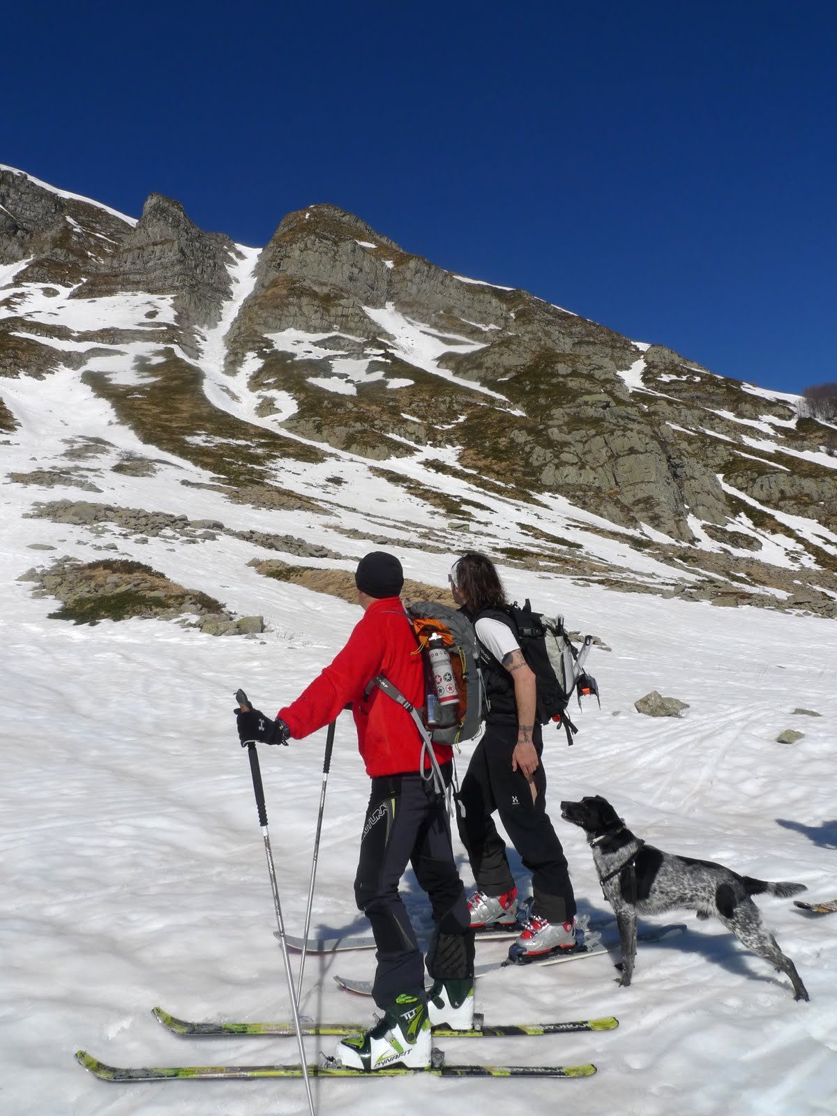 Sono euforico, mi chiedo come dev’essere con una bella neve trasformata? mmm… non vedo l’ora di rifarlo! Ci ricompattiamo nel vallone del Lago Baccio, breve sosta per mangiare qualcosa, ma Spalla che fine ha fatto? Ovviamente i cellulari non prendono, non importa, tanto dopo pochi minuti lo vediamo sbucare con Roccia al seguito. Una volta raggiunti ci racconta di essere sceso dal Rondinaio: la neve è ancora bella duretta! Un’ottima notizia… la nostra prossima meta è decisa!