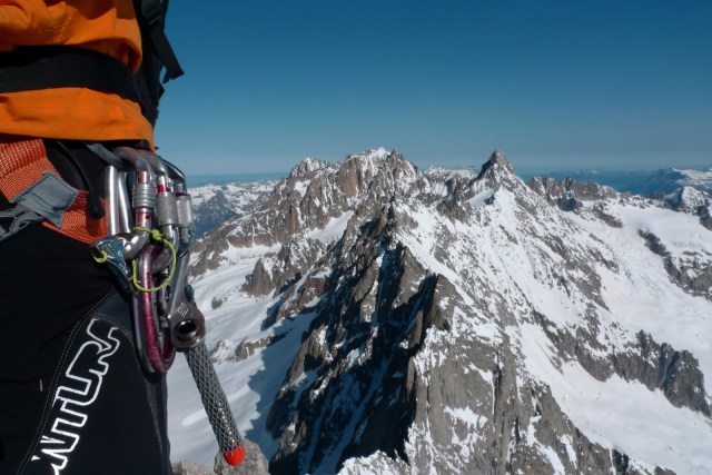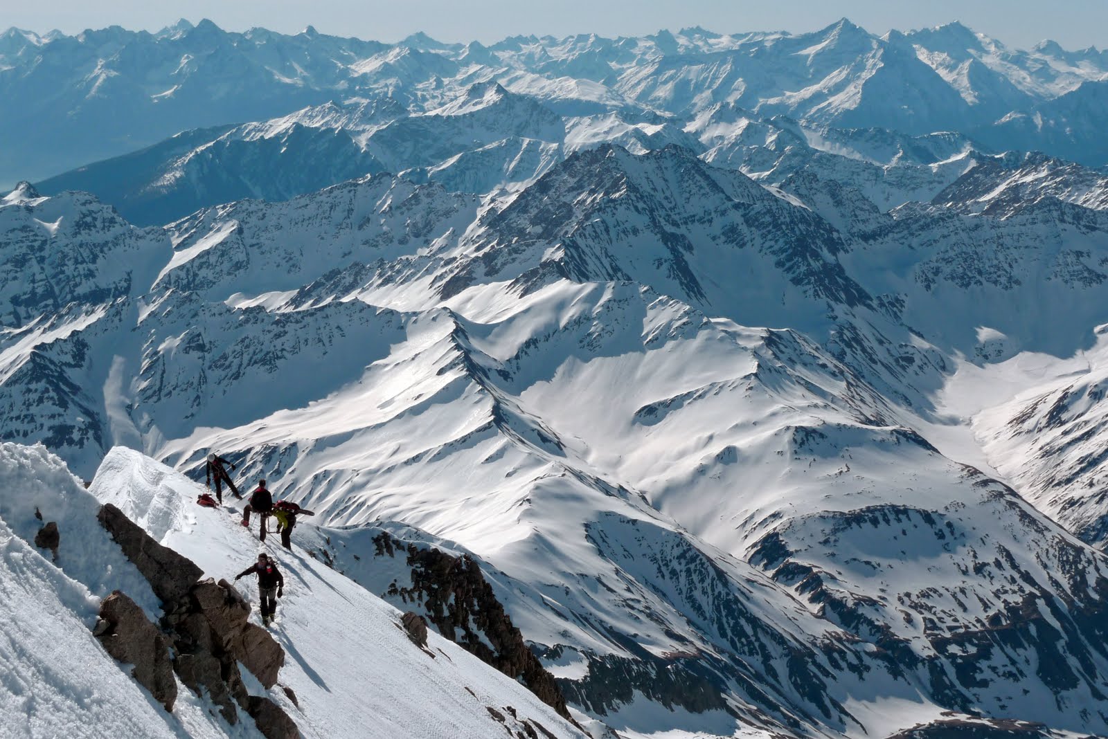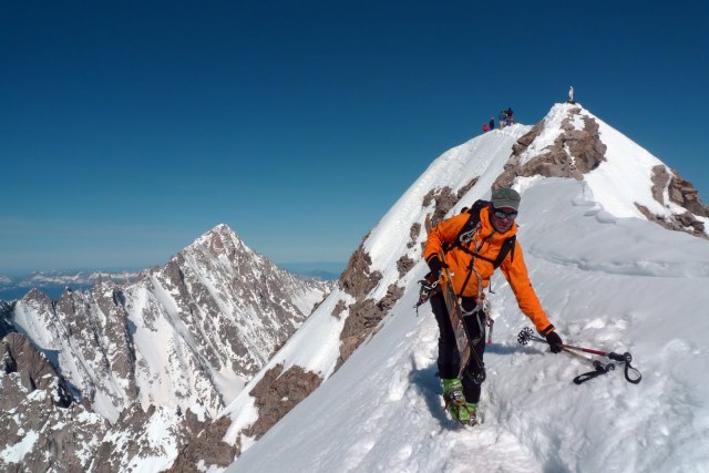 Lasciati gli sci affrontiamo quest’ultima prova e finalmente siamo sulla vetta del Mont Dolent. Non c’è tanto spazio, cerco di non pensare al vuoto che mi circonda. Il panorama in compenso è commovente. La montagna segna il confine tra Italia, Francia e Svizzera. Perfetto direi per il nostro gruppo multi-etino. Guardo verso la Svizzera e intravedo un monte che domina su tutti gli altri. Albi mi dice che potrebbe essere il Grand Combin: la prossima meta in programma per il massacrante giro di cicloalpinismo di quest’anno.