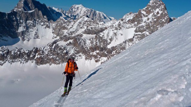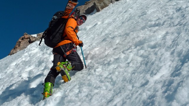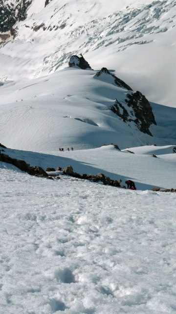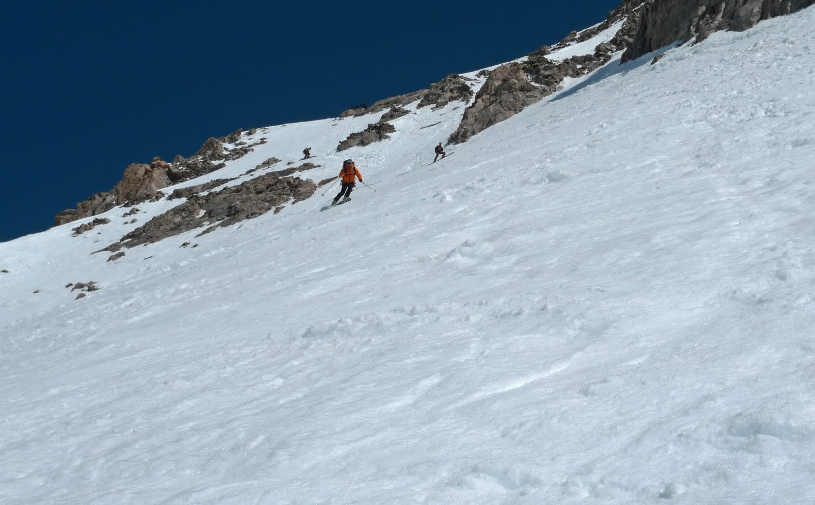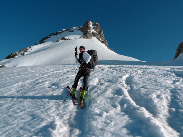 Prima del pianoro antistante al Dolent ci aspetta un bel ripidone ghiacciato. Il sole e la calura quasi estiva non hanno ancora intaccato il manto nevoso. Dopo un numero imprecisato di inversioni al limite riusciamo finalmente a superare questo tratto non banale.