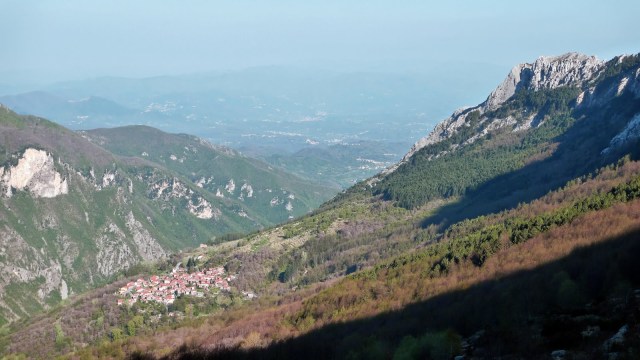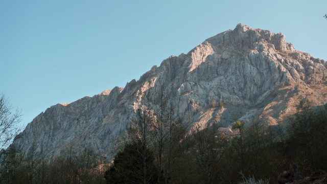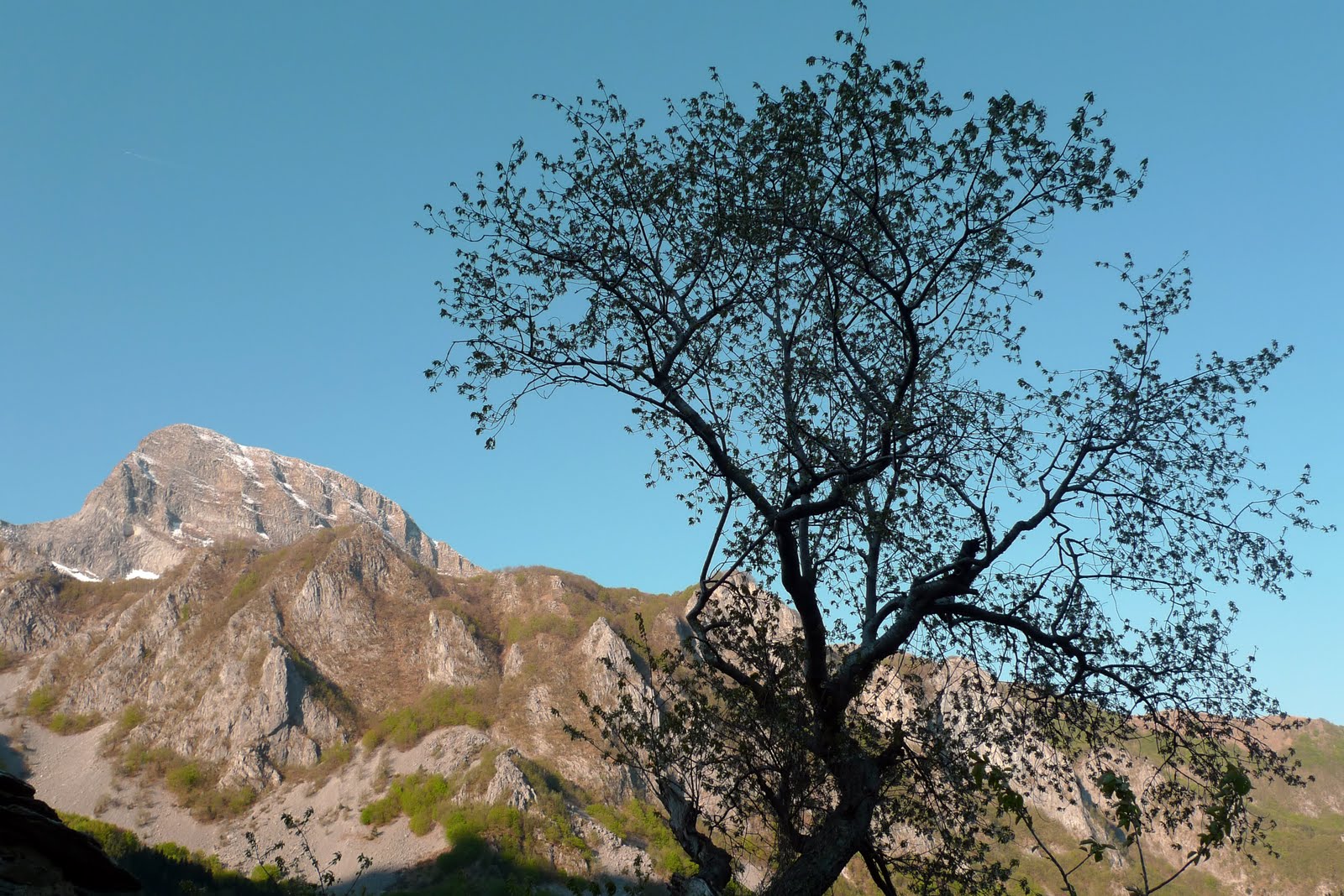 Passiamo il paese e parcheggiamo dopo un paio di chilometri in una stretta valle circondata dalle imponenti pareti bianche delle Apuane. Alla nostra destra intravediamo tra gli alberi il nostro obiettivo: Monte Pizzo d’Uccello. Ho già le vertigini, un muro di centinaia di metri di roccia che si staglia sulla vegetazione. Ma come mi è venuta l’idea di andare ad arrampicare con questi due insiminiti?! La morte è vicinaaaaa!