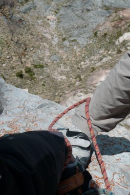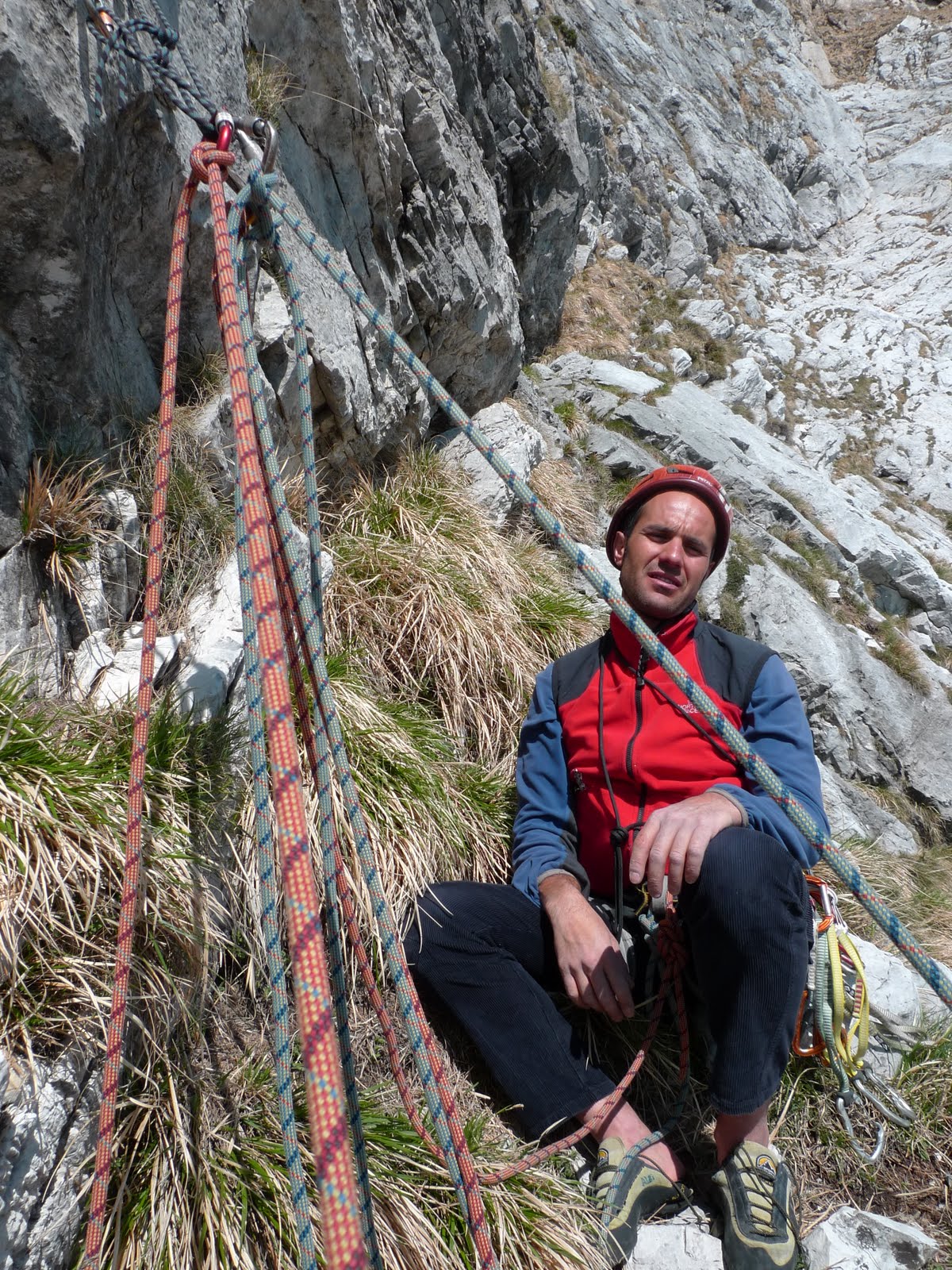 La salita procede lentamente, senza grossi intoppi. Sono un pò stanchino dalla giornata precedente sugli sci, ma le braccia sembrano tenere bene. Si vede comunque che sono in tensione: non sparo le solite caxxate e mi concentro al massimo sulle manovre da fare. Non di può certo prendere l’arrampicata in maniera leggera come con la mtb. Il pericolo è sempre presente e normalmente gli errori si pagano molto cari. Ci fermiamo per una breve sosta per mangiare… era ora, il mio stomaco sta brontolando da più di un’ora. Per fortuna non siamo costretti a mangiare appesi, la sosta per una volta è spaziosa. Aspettiamo che un altro gruppo di scalatori liberi la nostra via e ripartiamo.