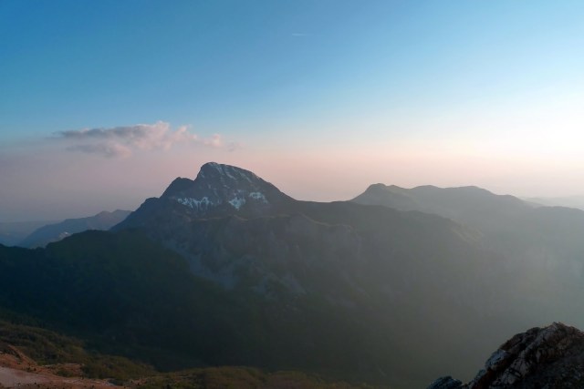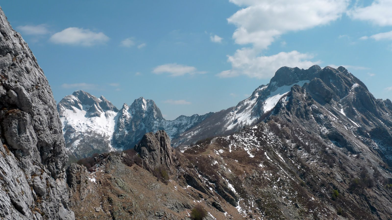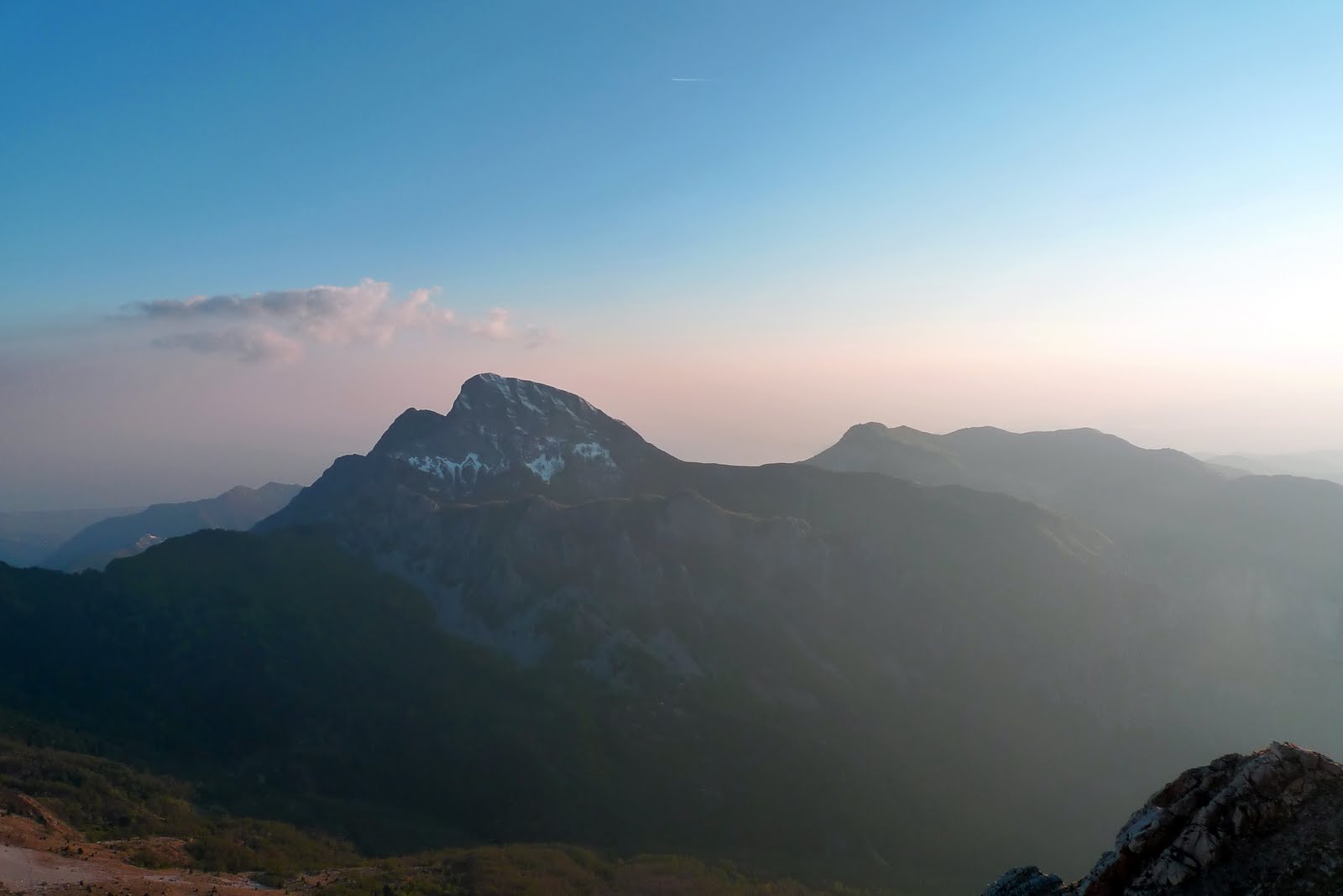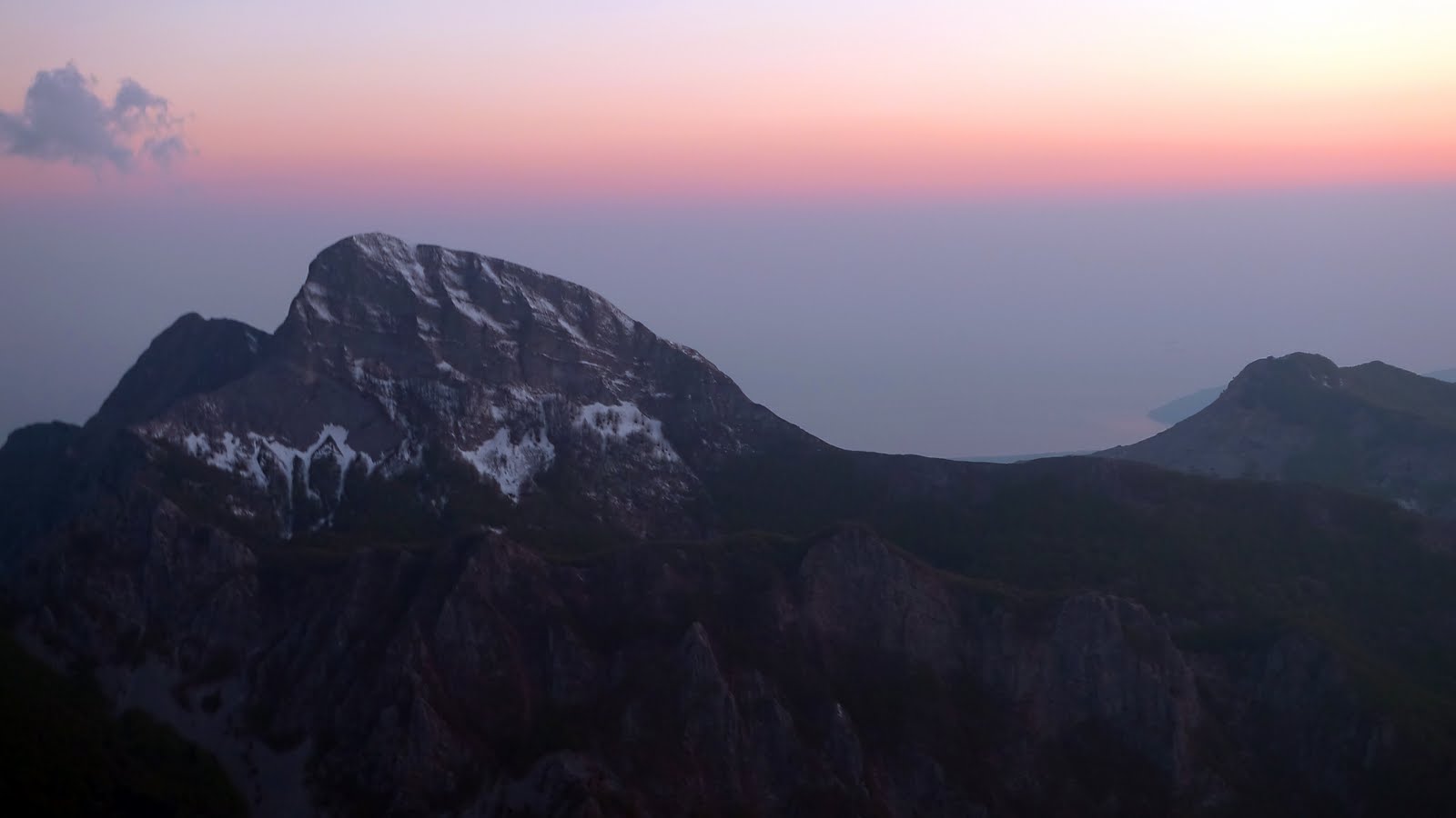 Albi ci sprona nella nostra avanzata, noto un pò di tensione nella sua voce. Come ciliegina sulla torta Albi fatica a trovare l’ultimo tiro: gli spit spariscono improvvisamente. Questo tratto non è certo banale, la nostra guida torna più volte sui suoi passi.Alla fine riesce comunque a raggiungere una zona adatta dove fare la sosta. In un passaggio mi faccio prendere un po’ dal panico e arranco in maniera scomposta per superarlo. Sono stanco sia per la fatica che per la continua tensione. Ho veramente voglia di concludere la giornata. Dopo quest’ultima fatica arriviamo sul sentiero cai che ci riporterà alla macchina. Ormai il sole è calato quasi completamente. Il tramonto, in questa corsa contro il tempo, alla fine ci ha raggiunto. Il panorama è meraviglioso, la nostra vista spazia da montagne innevate al mare. In questi momenti mi rendo conto di quanto le Apuane siano uniche e affascinanti.