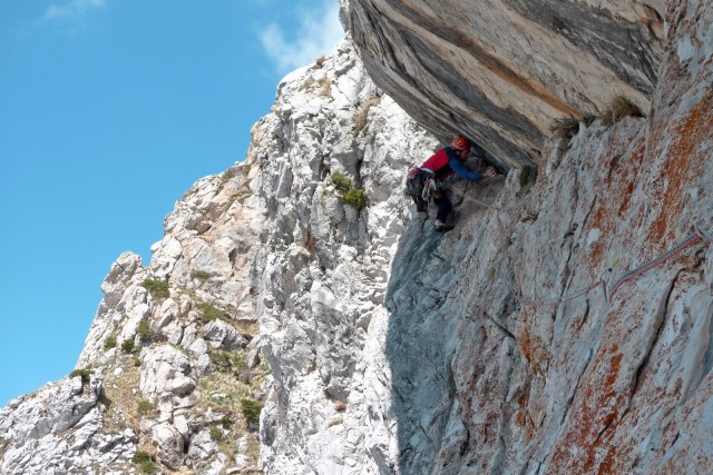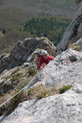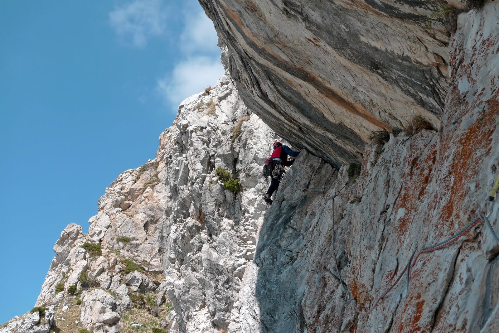 Ci prepariamo per l’ascesa, guardo in alto, non riesco assolutamente a capire dove dobbiamo passare. Intanto Albi studia la via da fare: mi dice che faremo una prima parte chiamata Heidi e un un ultimo tratto chiamato Dinko. La difficoltà maggiore saranno un paio di tiri di grado 5c, niente di assurdo, però il timore resta annidato nel mio cervellino. La paura maggiore è focalizzata  sul numero di tiri da completare, almeno quindici scoprirò alla fine, ma riuscirò a resistere?
