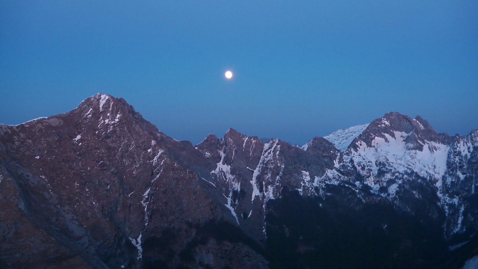 Altre due interminabili ore di scarpinata ci separano dalla macchina. Mi ricordo improvvisamente di avere la pizza ancora nello zaino, mi viene subito l’acquolina in bocca. Nonostante che la Fede mi abbiamo cagnato per averla presa, decido di offrirla a tutti. Intanto la luna piena illumina la nostra cima, questo ricordo vale sicuramente tutta la fatica fatta, penso fra me. Dopo un tempo che mi è sembrato infinito raggiungiamo la macchina. Sono “solo” le dieci di sera ed è dalle 5 che sono sveglio, adesso capisco perchè mi sento uno straccio. In qualche modo troviamo una specie di bar aperto e ci fiondiamo dentro come proiettili. La birra e il panino non sono mai stati così buoni. Adesso però ci aspetta un’ultimissima prova: dobbiamo tornare a casa. Albi coraggiosamente prova a guidare, ma ben presto viene sopraffatto dalla stanchezza. Certo che è già stato un eroe a farsi tutta la scalata da primo zavorrato per di più da un principiante come me. Subentro io e miracolosamente li riporto a casa. Un saluto veloce e poi mi dirigo verso la mia “vera” casa. Arrivo verso le 2.30 del mattino. Non c’è un muscolo che non mi faccia male, ma la felicità è infinita. Sono finalmente nel mio letto. Sprofondo in pochi secondi in un sonno profondo, nessun incubo per me questa notte, il mio è già durato tutto il giorno.