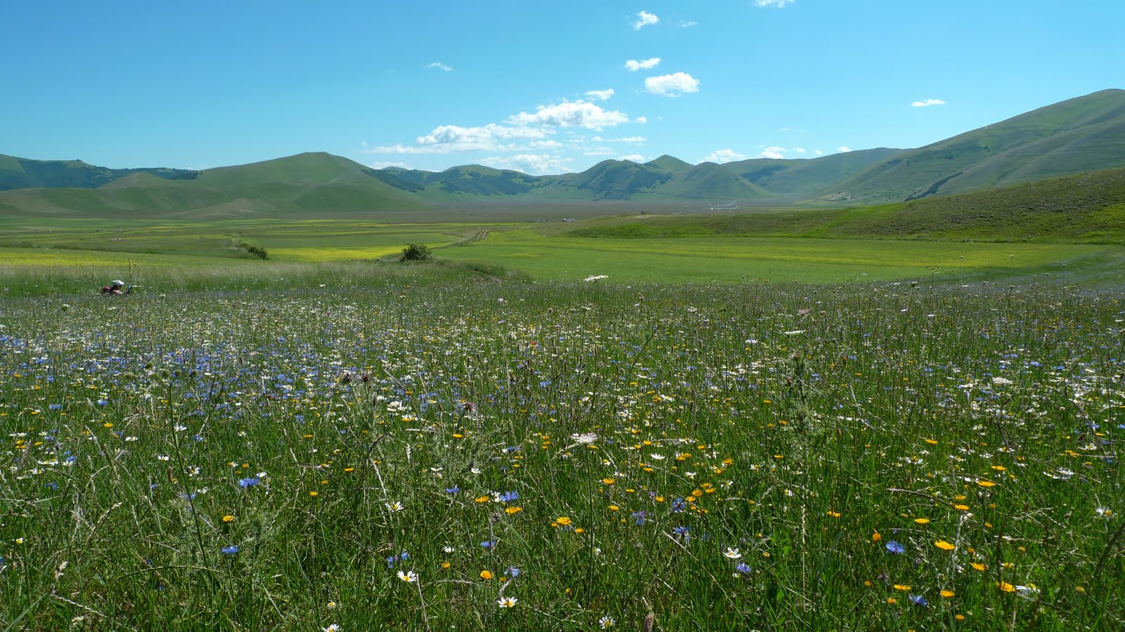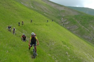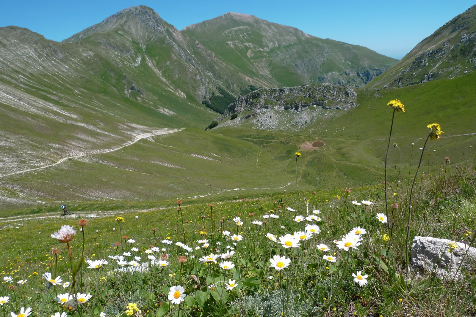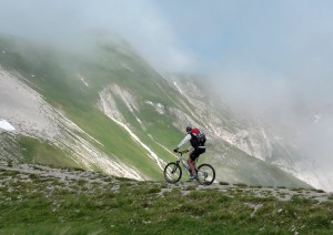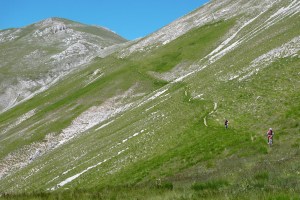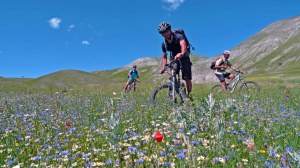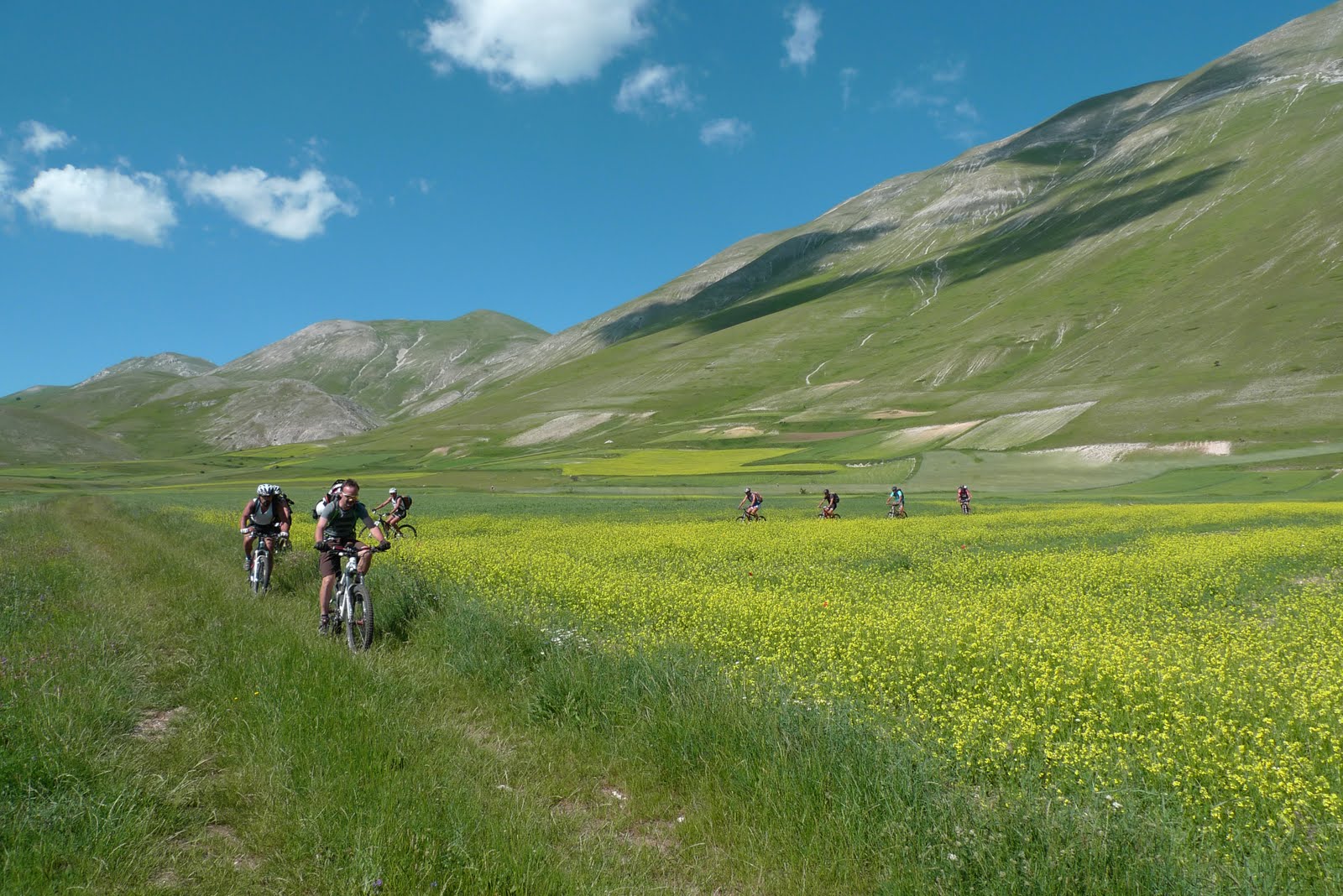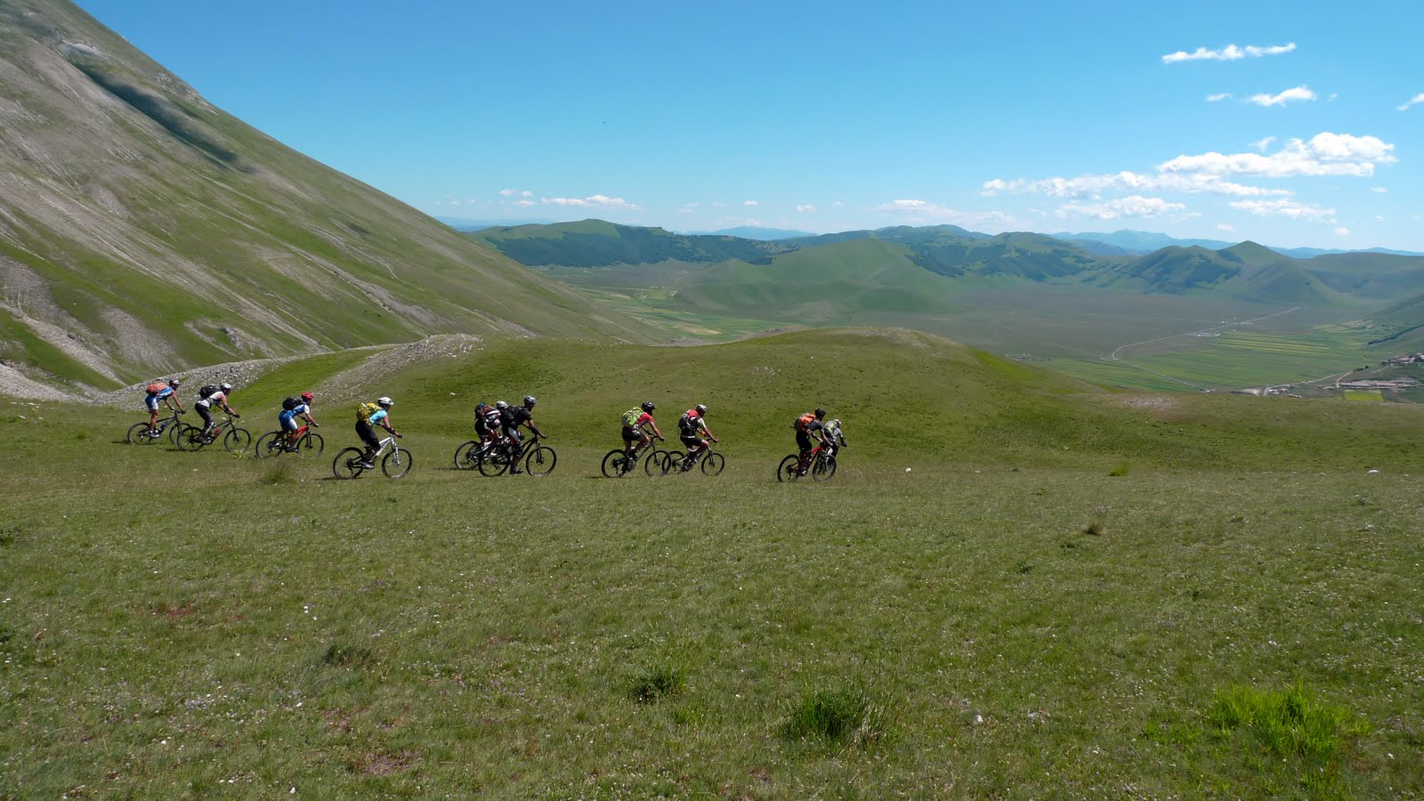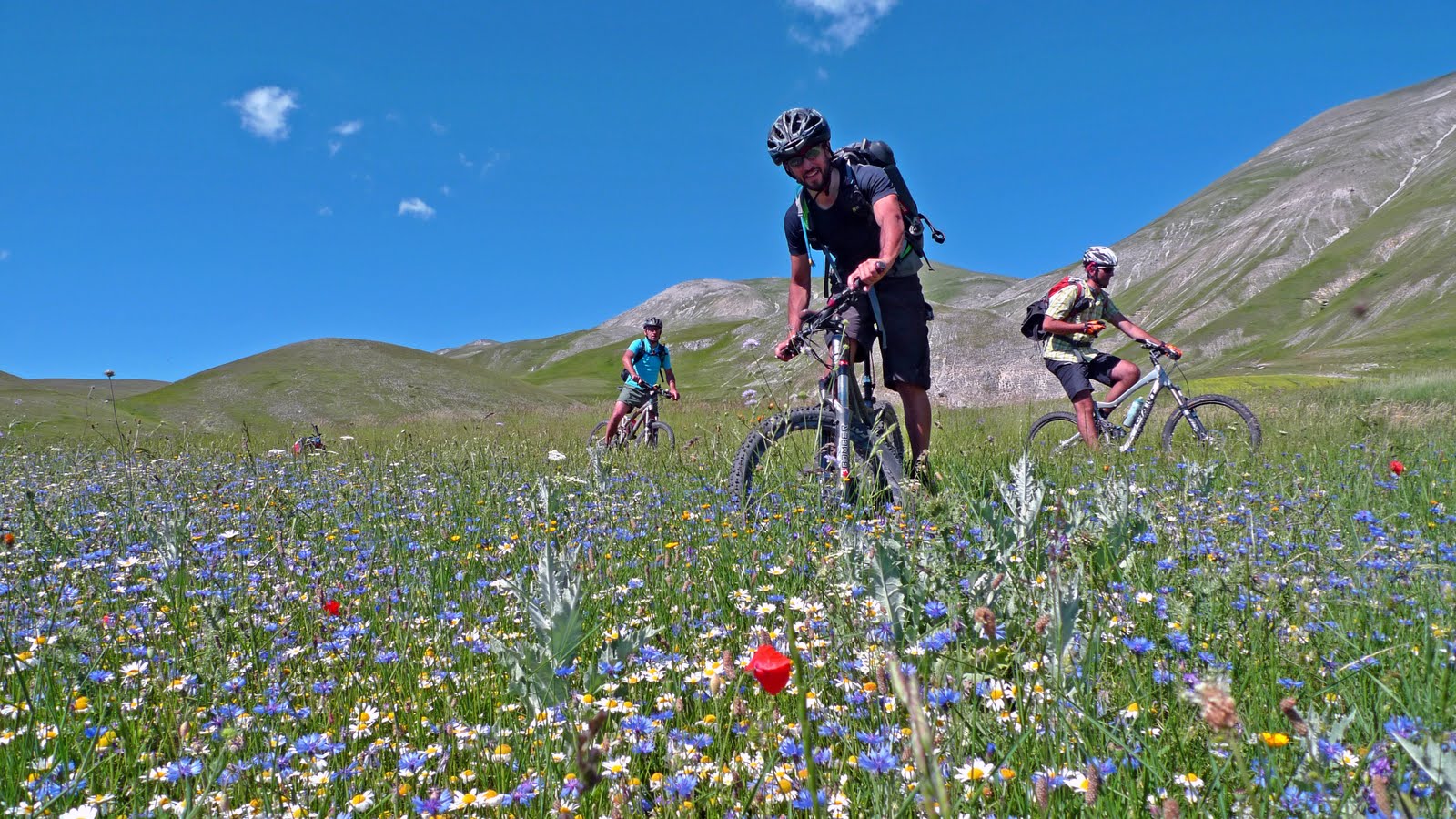 Caratterizzati da un ambiente mutevole, i Sibillini non si possono descrivere rinchiudendoli in una semplice categoria. Ad ogni passo e valico che si affronta il paesaggio cambia completamente lasciando spiazzati e stupiti gli osservatori. Si passa da paesaggi tipicamente alpini caratterizzati da montagne rocciose quasi dolomitiche a crinali completamente ciclabili e arrotondati tipici dei nostri Appennini. Il luogo che però si distingue da tutti i posti che ho visto in mtb è l’incredibile piana di Castelluccio. Un altopiano a circa 1500 metri sul livello del mare completamente ricoperto da distese di fiori e circondato da colline verdissime. Un posto magico, lontano anni luce, ma allo stesso tempo vicino geograficamente ai monti che lo dominano dall’alto.
