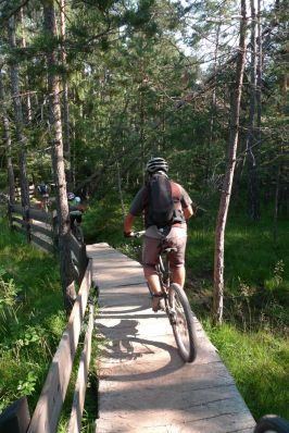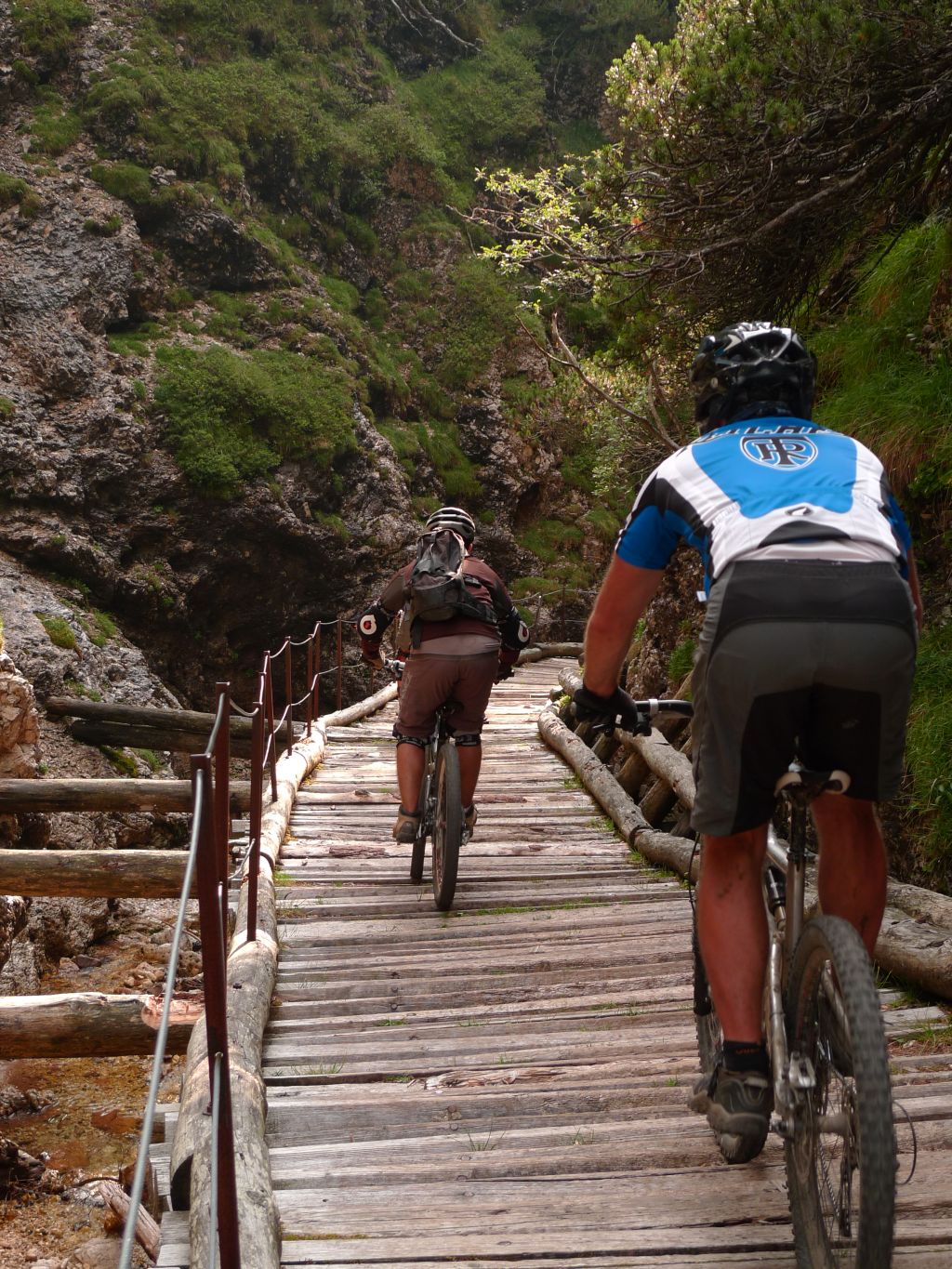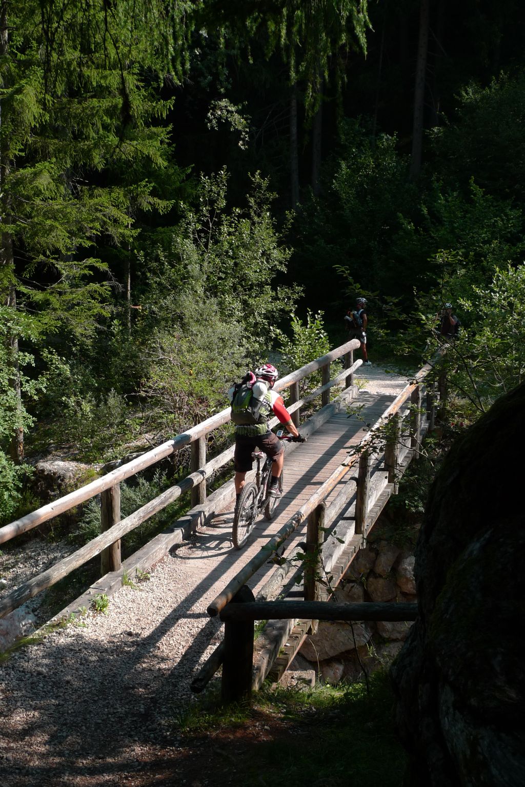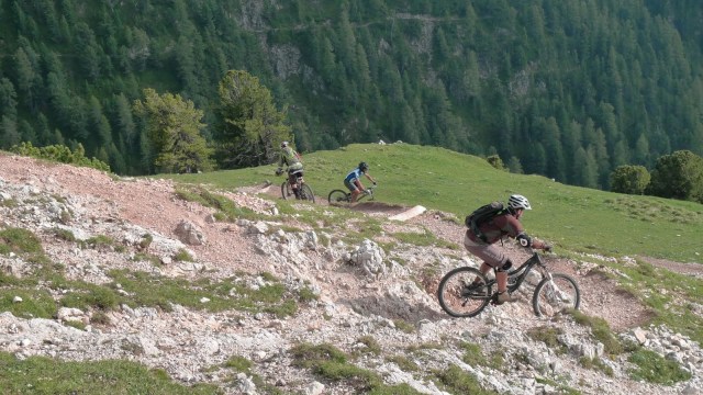 Ci mettiamo d’accordo con gli indomiti trasfertisti per un ritrovo ai Laghetti di Fiè. La sveglia per loro è improponibile e noi “local” abbiamo anche il coraggio di arrivare in ritardo. Dopo i doverosi saluti e abbracci, ormai non mi ricordo neanche più le loro facce, partiamo inarrestabili. Peccato solo che in poche centinaia di metri Sergione pizzica e io mi ritrovo a smontare la guarnitura. Magari se il giorno prima montavo la corona alla dritta era meglio. Risolte queste quisquilie tecniche, ripartiamo percorrendo un bel sentierino in mezzo alla pineta pieno di ponticelli e rilanci in salita.