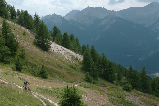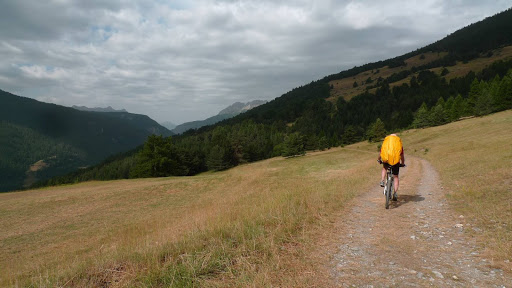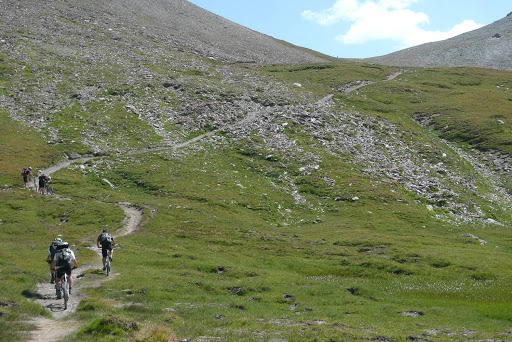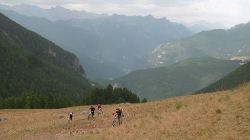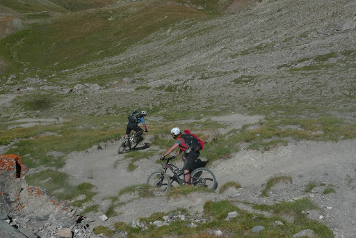 Fatta un’abbondante colazione partiamo tutti imbacuccati per proteggerci da una temperatura da battere i denti. Oggi è l’ultimo giorno del tour e purtroppo anche il più duro. Mi sento comunque al settimo cielo per aver scoperto questa poco frequentata e non solo per questo incantevole regione delle alpi francesi. Il giro parte purtroppo in discesa e in pochissimo tempo perdiamo gran parte del dislivello duramente conquistato il giorno precedente. Raggiunto il fiume Le Guil affrontiamo un’altra interminabile salita prima su asfalto e poi su carraia che ci porterà al col di Bramousse. Prima di raggiungerlo però decidiamo di fare una sosta merenda in un caratteristico gite d’etape nel paese di Bramousse. Una volta al passo le fatiche non sono certo finite, giusto il tempo di prendere fiato e prendiamo un singletrack con pendenze al limite della sopportazione. Dopo un primo tratto piuttosto ostico la salita molla un pochino la presa e riusciamo anche a guardarci attorno gustandoci la vista che il Queyras ci offre.