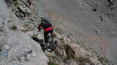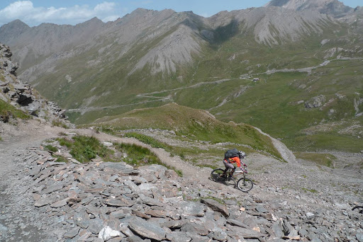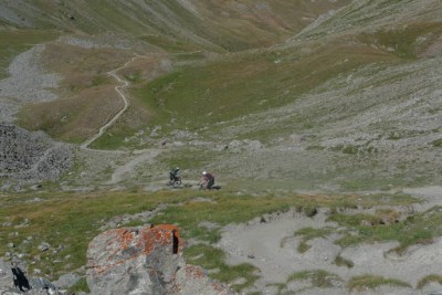 Ammiriamo il panorama meraviglioso che si gode dal colle e ci sentiamo elettrizzati per l’inizio assolutamente promettente del nostro viaggio. Notiamo in lontananza l’imponente e solitario Monviso che svetta imponente su tutte le altre vette, non potevamo chiedere di meglio da questa prima giornata di pedalata. Dopo aver un po’ recuperato le forze ed esserci saziati della spettacolare vista ci lanciamo lungo una sentiero in discesa che taglia come una lama il pendio detritico. Siamo ritornati praticamente ai piedi del colle d’Agnello, sulla strada percorsa solo poche ore in macchina per raggiungere Saint Veran. Il confine con l’Italia è a poche centinaia di metri anche se lo spirito totalmente differente dei francesi nel vivere la montagna ci fa sembrare la nostra patria distante anni luce.