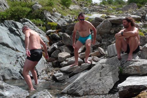 Siamo completamente presi dalla bellezza del sentiero, perfetto per le nostre amate mtb e sfrecciamo urlanti disegnando curve e affrontando gradoni tecnici senza paura. Nonostante l’isteria collettiva per la discesa ci fermiamo improvvisamente nelle vicinanze del torrente. L’acqua è talmente invitante che, complice il tepore estivo di questa giornata, in una frazione di secondo ci ritroviamo mezzi nudi con i piedi a mollo. Ovviamente il pediluvio degenera in un corroborante nonché scioccante bagno integrale nel fiume gelato. Ruttok è sempre in pole position quando si tratta di tuffarsi in acqua e ci spinge per emulazione a seguirlo.