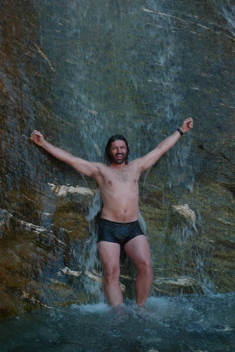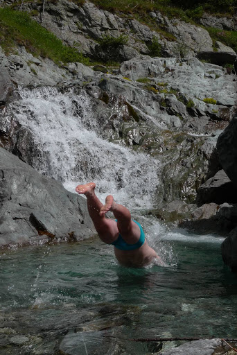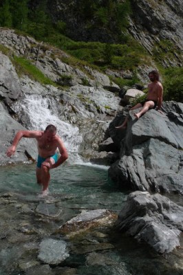 La discesa perde forza e vigore, una volta raggiunto un torrentello la fine dei giochi è prossima. Una cascatella d’acqua glaciale attrae immediatamente l’attenzione del bimbo che c’è in Ruttok. Mi distraggo due secondi e voltandomi lo vedo già mezzo nudo sotto l’acqua che se la gode. Appena vede dell’acqua perde letteralmente la testa e la sua parte fanciullesca prende il sopravvento.