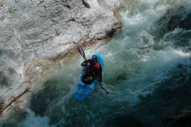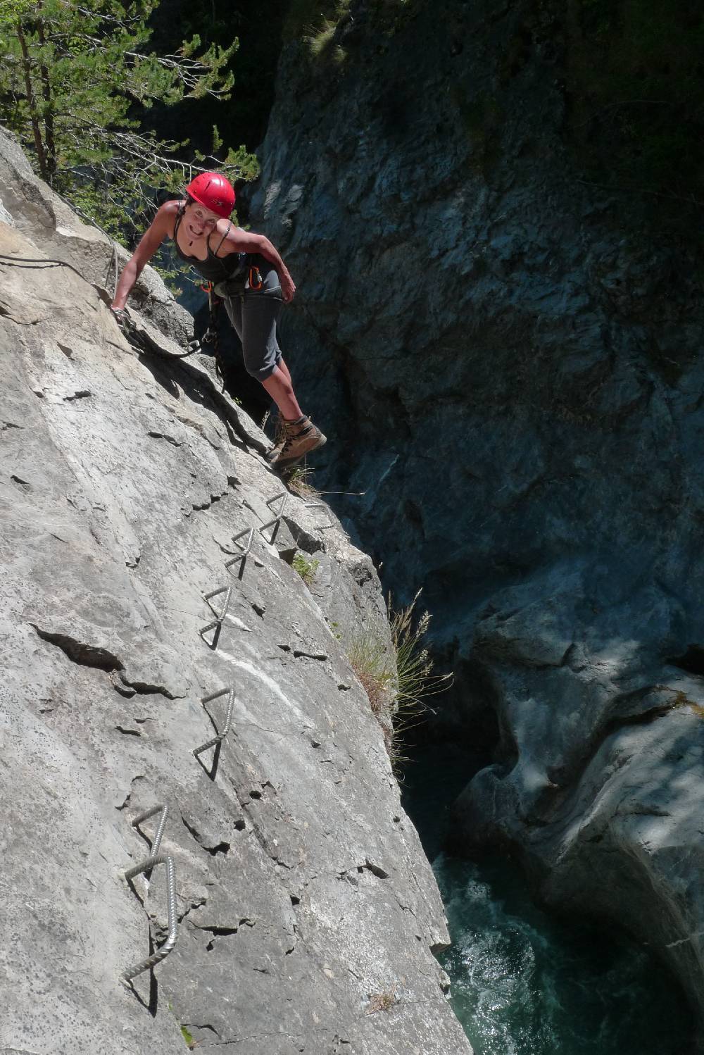 Non resistiamo neanche un minuto, ci mettiamo l’imbrago sperando che le vesciche non rompano più di tanto. La scelta suicida è stata però vincente, infatti la Sammy pena decisamente meno lungo la ferrata che a camminare normalmente. Il percorso balza da una parte all’altra del torrente, sotto di noi i canoisti lottano contro le rapide rendendo l’arrampica ancora più avvincente.