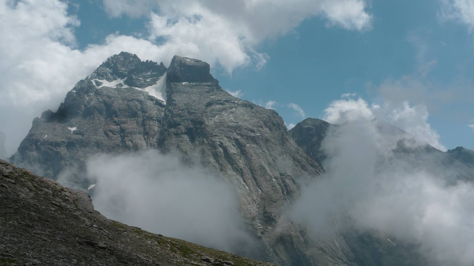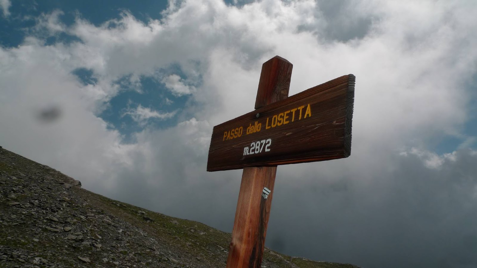 Sicuramente tutti i tratti inciclabili che stiamo affrontando saranno ampiamente ripagati. Arriviamo stanchini al col Losetta a 2870 metri e davanti a noi si para l’imponente parete del Monviso purtroppo parzialmente velata dalle nuvole.