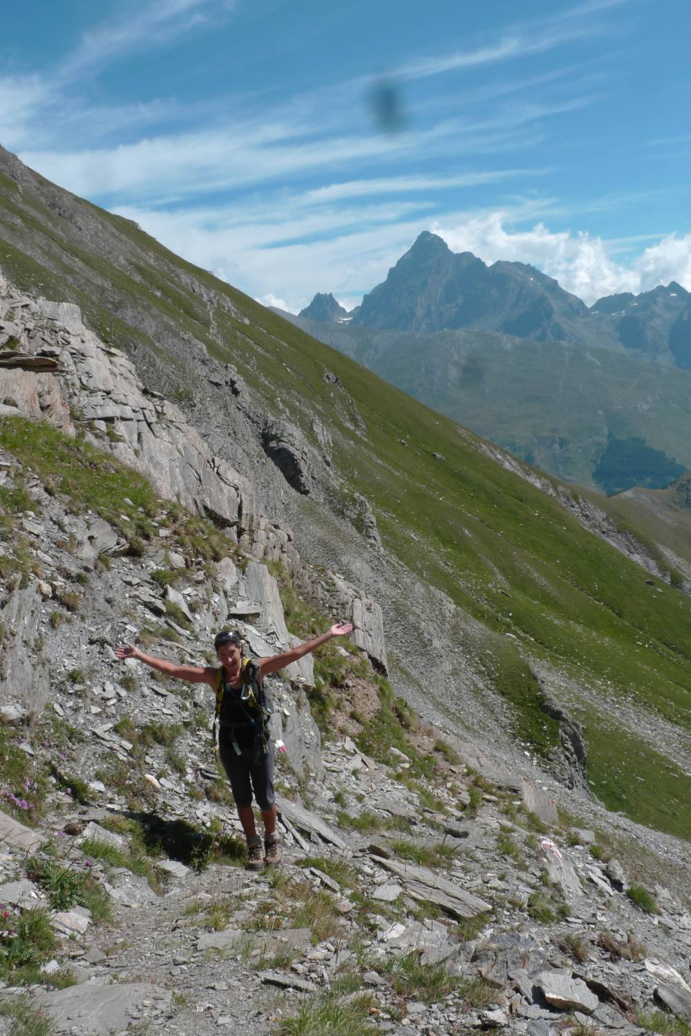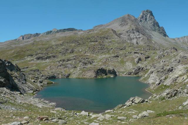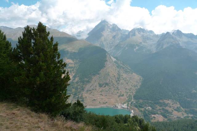 La vista a picco sul lago e su tutta la Varaita alta è strepitosa e il Monviso, con il solito pennacchio di nuvole sulla vetta, sembra a un passo da dove mi trovo.