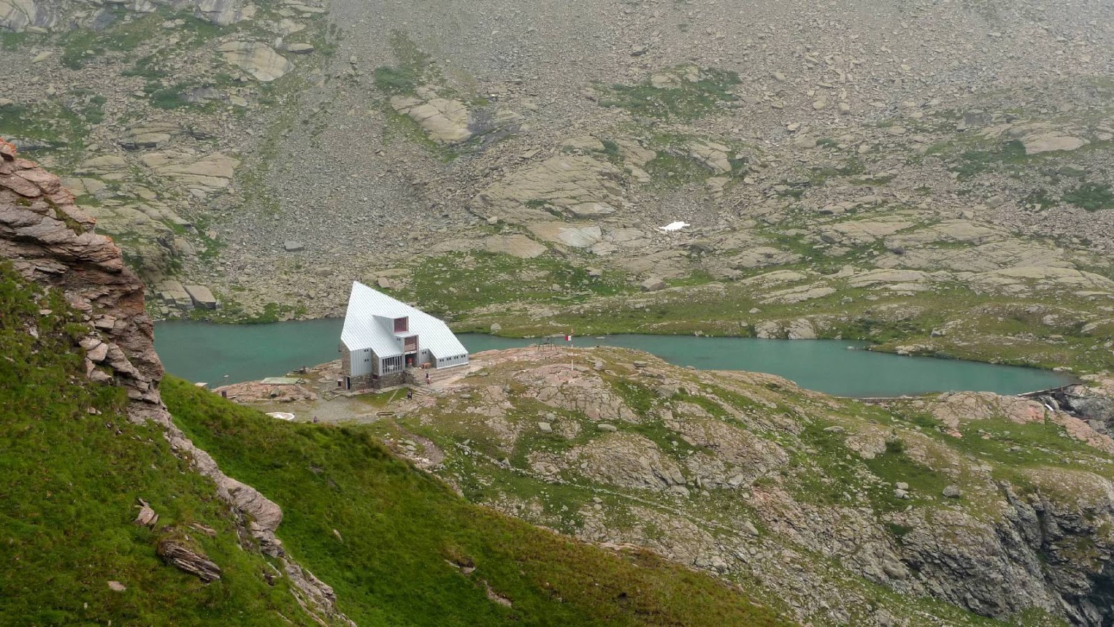 Riprendiamo così il cammino lungo un sentiero molto tecnico e al limite della fattibilità. Per fortuna il tratto roccioso è breve e in un baleno raggiungiamo il vallone di Vallanta. Alla nostra sinistra intravediamo tra le nebbie il rifugio Gagliardone, una strana struttura che sembra sporgersi curiosa verso il Monviso, come in ammirazione.