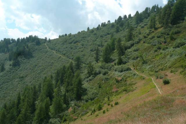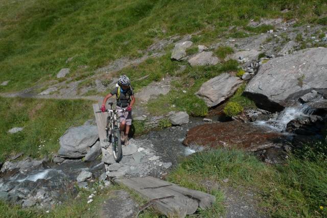 Appena raggiunto l’asfalto lo lasciamo immediatamente imboccando la stupenda e isolata val di Soustra. In brevissimo tempo però ci rendiamo conto che la ciclabilità del sentiero in salita è poca, troppo poca, mentre se affrontata nel verso opposto sarebbe stata una libidine in discesa. Ogni pezzo di spingismo mette a dura prova la mia fede sul rifugista, confido però nella seconda parte del giro che affronteremo in discesa.