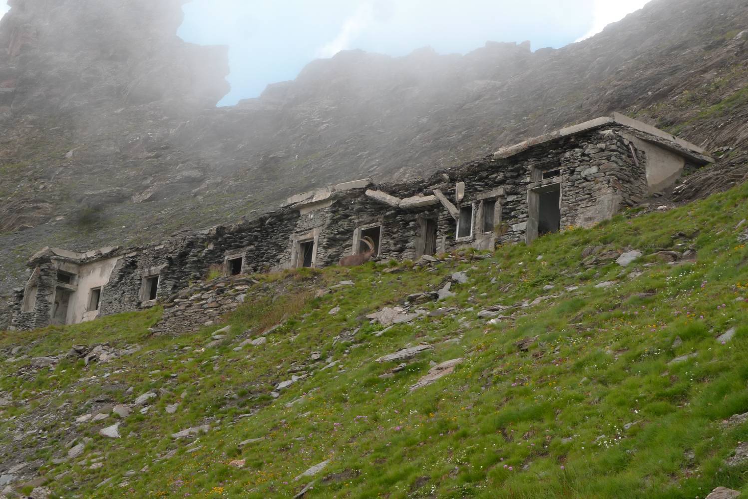 Vicino al sentiero sorgono alcuni ruderi militari che decidiamo di visitare. Improvvisamente sento la Sammy esclamare “e tu cosa vuoi? Dalla porta di un edificio esce un camoscio impettito che non infonde certo sicurezza. In un lampo ci rimettiamo in modo lasciandoci alle spalle l’ungulato minaccioso.