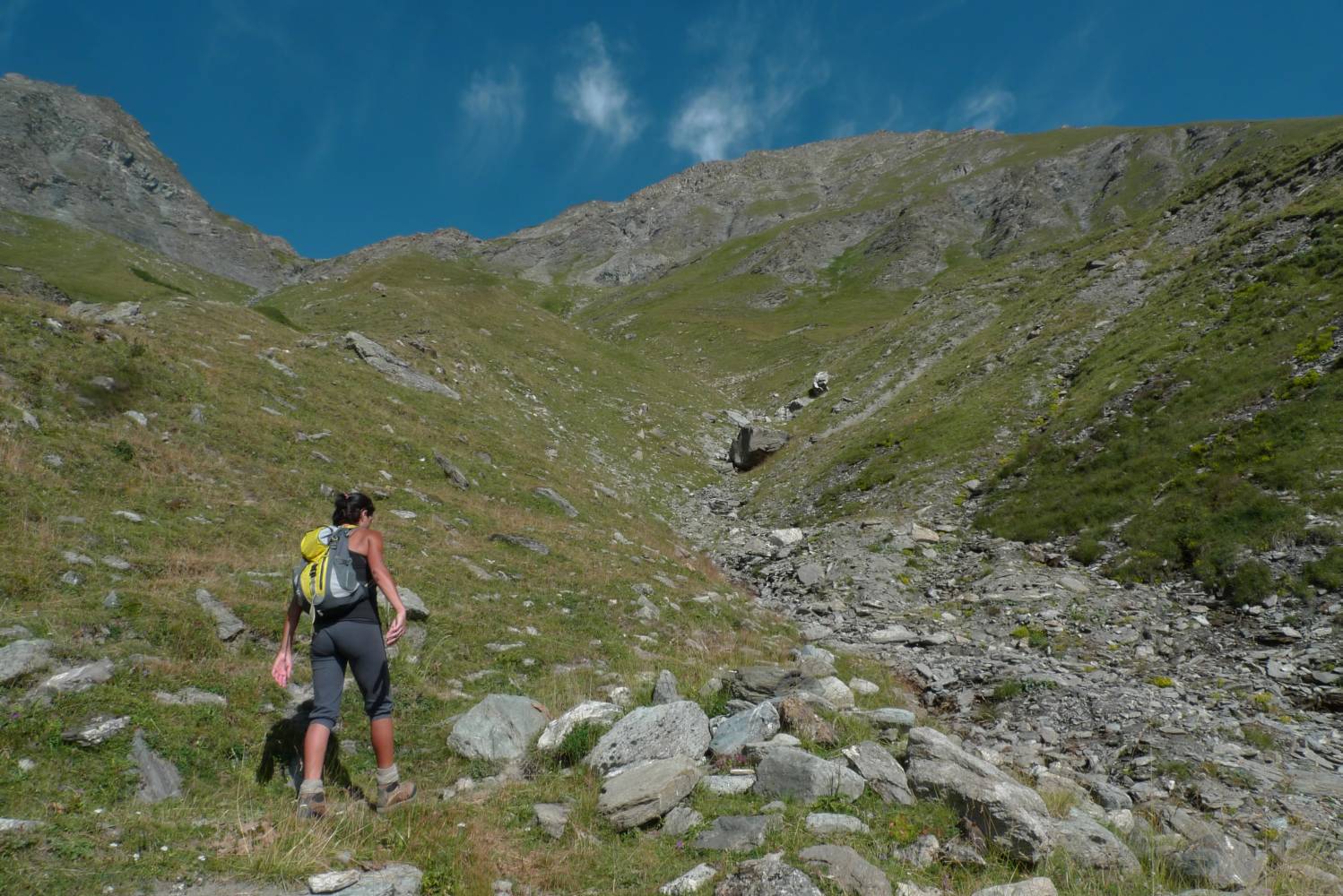 Partiamo direttamente dal rifugio a piedi, una bella comodità in effetti, inoltrandoci nella stretta valle del torrente Fiutrusa. Dopo un’oretta di cammino la valle si apre improvvisamente. Davanti a noi un immenso imbuto ghiaioso si inerpica fino al colle del Lupo.