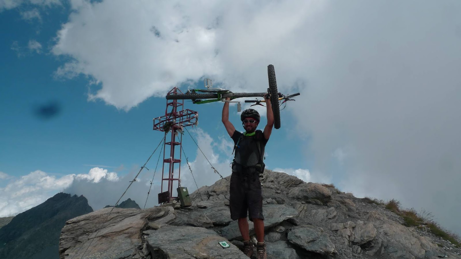 La Sammy decide di lasciare la bici al colle e salire a piedi, mentre io mi incammino lungo il pietroso pendio che porta al Losetta con la mia fidata bici sulle spalle. Mi è ancora incomprensibile del perchè un sano spingismo mi renda sempre felice a differenza della Sammy che giustamente lo detesta. maaaa! Arrivati in vetta purtroppo le nuvole cominciano ad accalcarsi attorno a noi velando parzialmente il panorama.