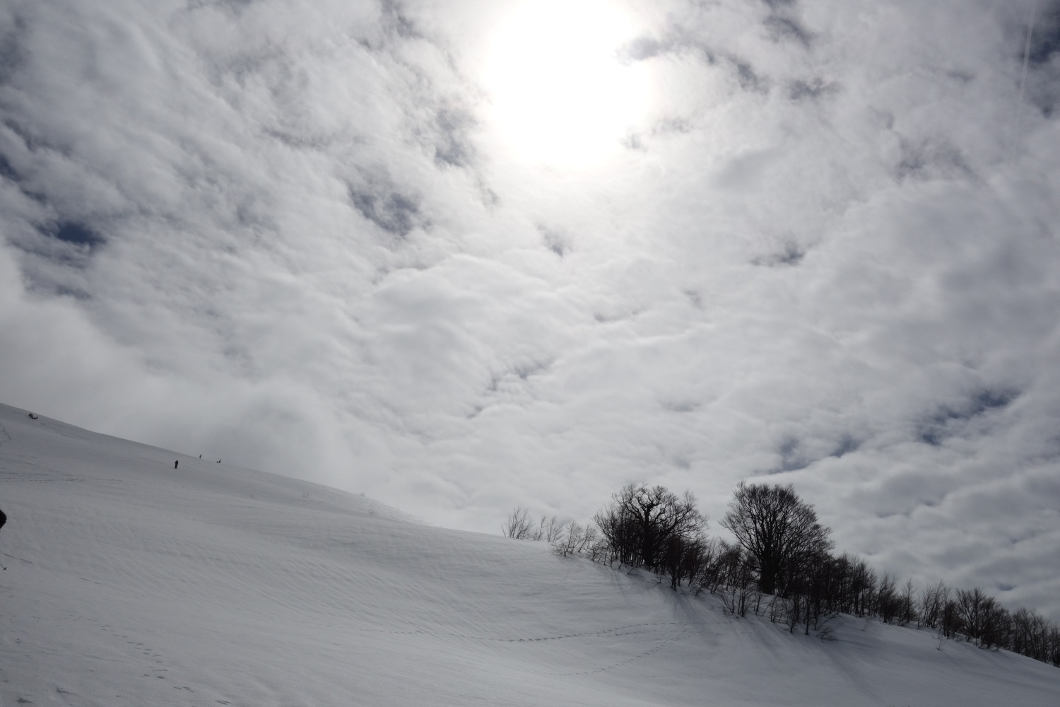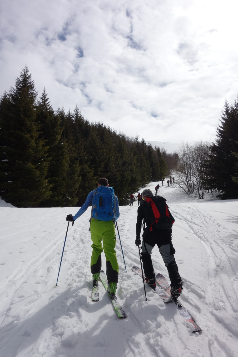 Nonostante il tempino siamo comunque in tanti ad aver deciso per una sgambata sulla neve. Ci accodiamo così ai vari gruppi di ciaspolatori, scialpinisti e tavolari guadagnando quota sulle ex piste di Doccia. La neve in basso è pesantuccia e incredibilmente abbondante per il periodo. Salendo comunque diventa sempre più asciutta e il vento alquanto gelido aiuta a conservarla a dovere.