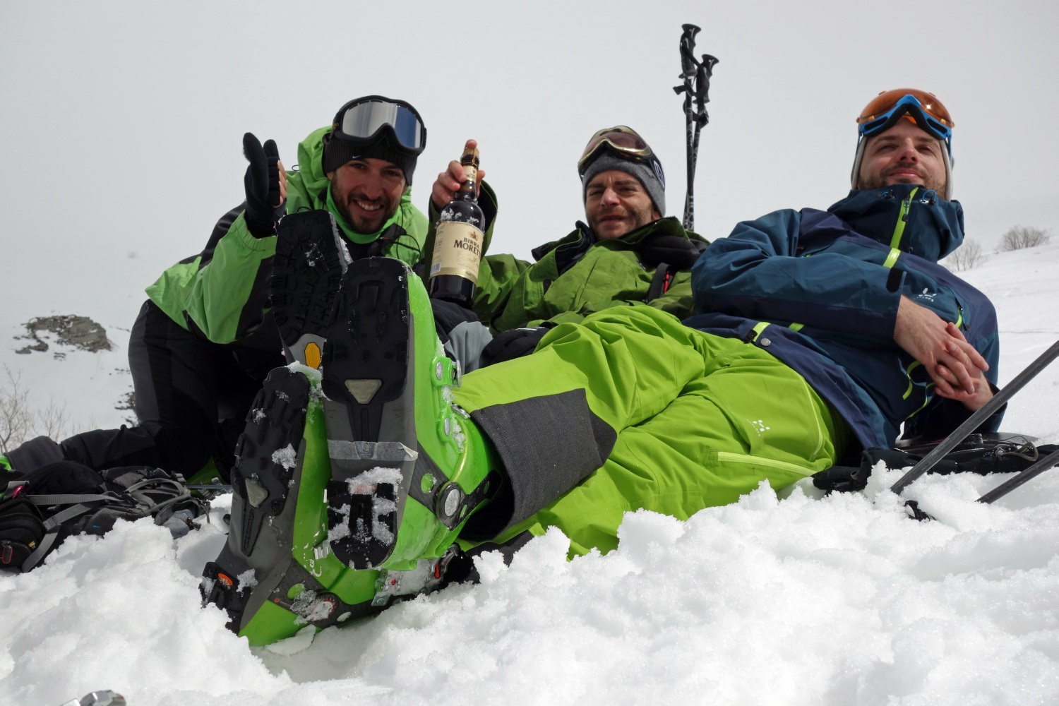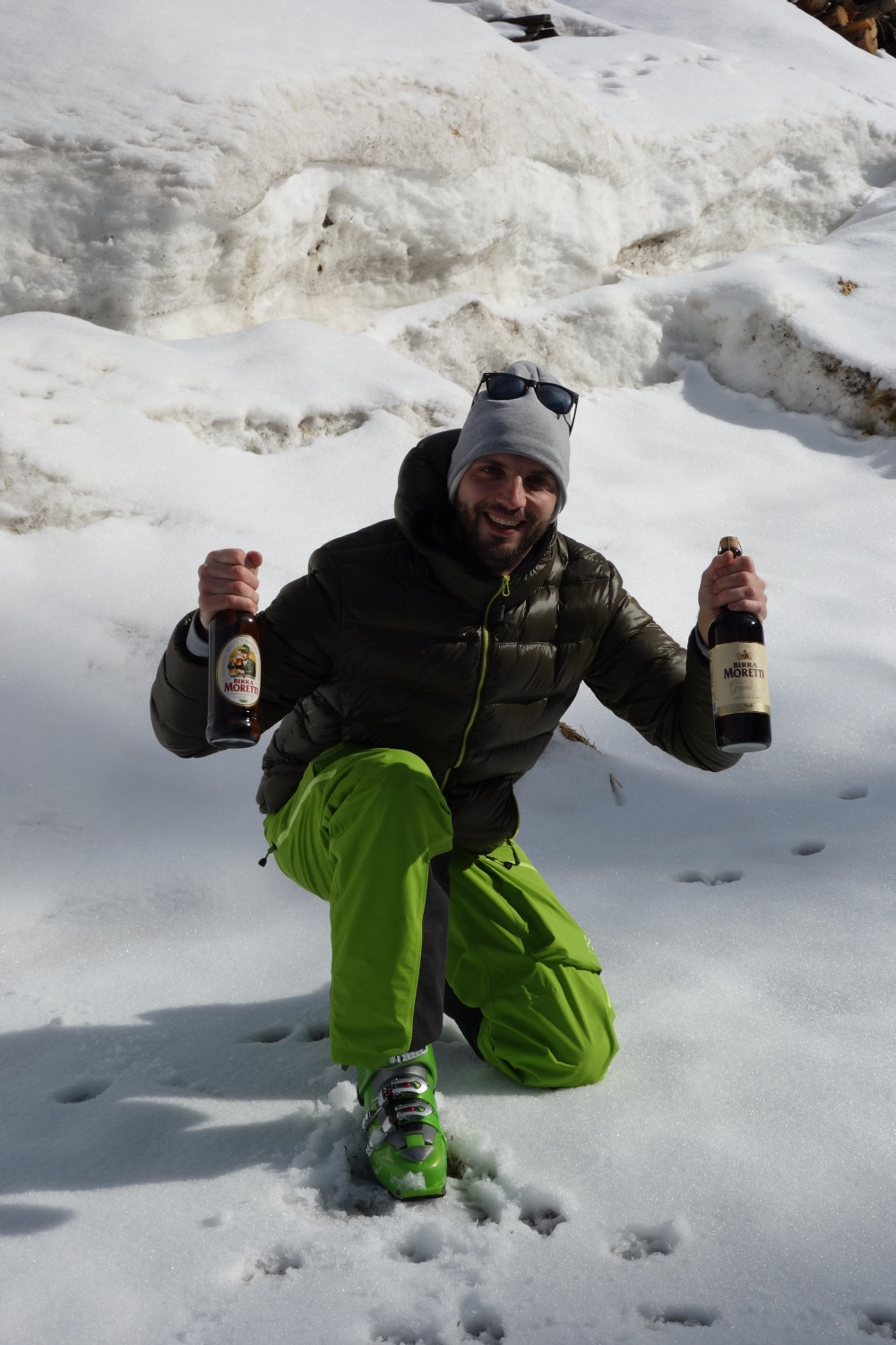 Siamo così doppiamente felici, cosa possiamo desiderare di più? Una discesa bellissima e una Moretti al nostro arrivo, da lacrimoni direi! Belli contenti affrontiamo l’ultimo tratto sulle piste su una neve collosa faticosa a mille fino a Capanna dei Celti. Qui non resistiamo alla tentazione e ci regaliamo la giornata perfetta con un cesto di tigelle e birre come non ci fosse un domani!