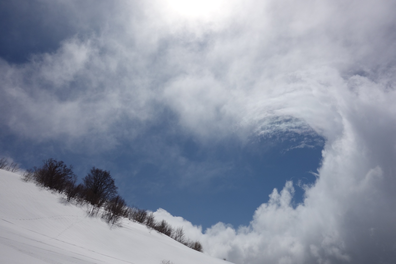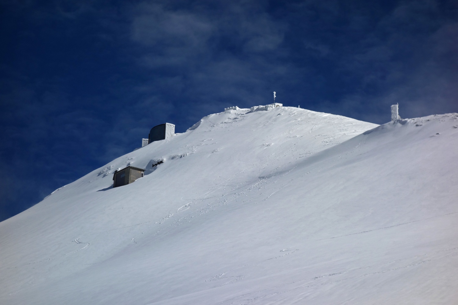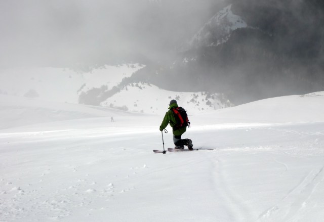 In breve arriviamo sull’orribile vetta del Cimone rifugiandoci vicino ad una struttura del CNR dalle sferzate gelide dell’implacabile vento. Intanto il sole ha trovato un nascondiglio migliore al riparo delle onnipresenti nubi. Dopo una veloce merenda e aver giustamente cazziato Dave per non aver portato con se la meravigliosa Moretti Grand Cru che aveva così orgogliosamente sfoggiato al parcheggio, ci prepariamo alla discesa. Aspettiamo qualche minuto l’apertura del cielo per poter orientarci e ci lanciamo lungo il lungo pendio a sud del Cimone. Siamo fortunati, la visibilità per un momento è ottima facendoci godere l‘incredibilmente e divertente firn primaverile.