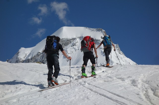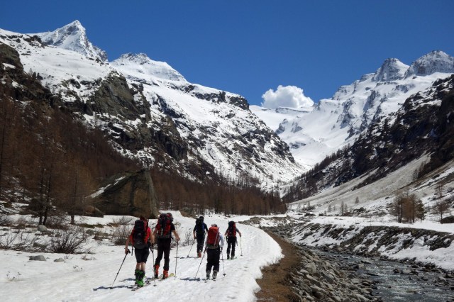 Nella tarda mattinata di sabato, con una calma quasi buddista, iniziamo con gli sci ai piedi l’avvicinamento sul facile percorso da sci fondo.