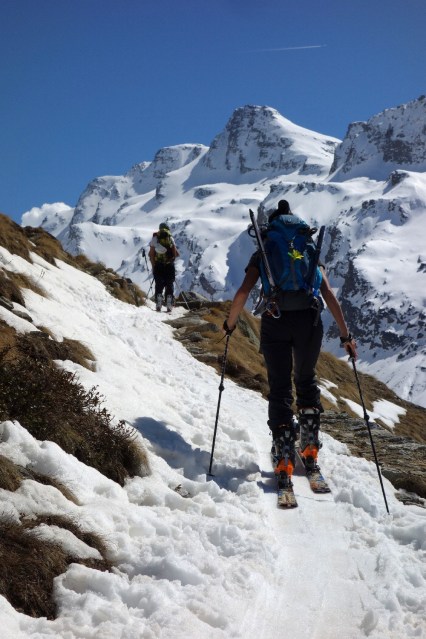 Purtroppo dopo pochi tornanti ci rendiamo ben presto conto che l’innevamento non sarà sempre sufficiente costringendoci anche a lunghi tratti con gli sci sulle spalle.