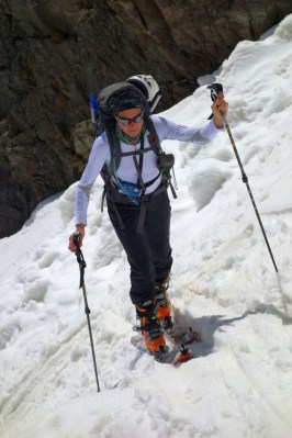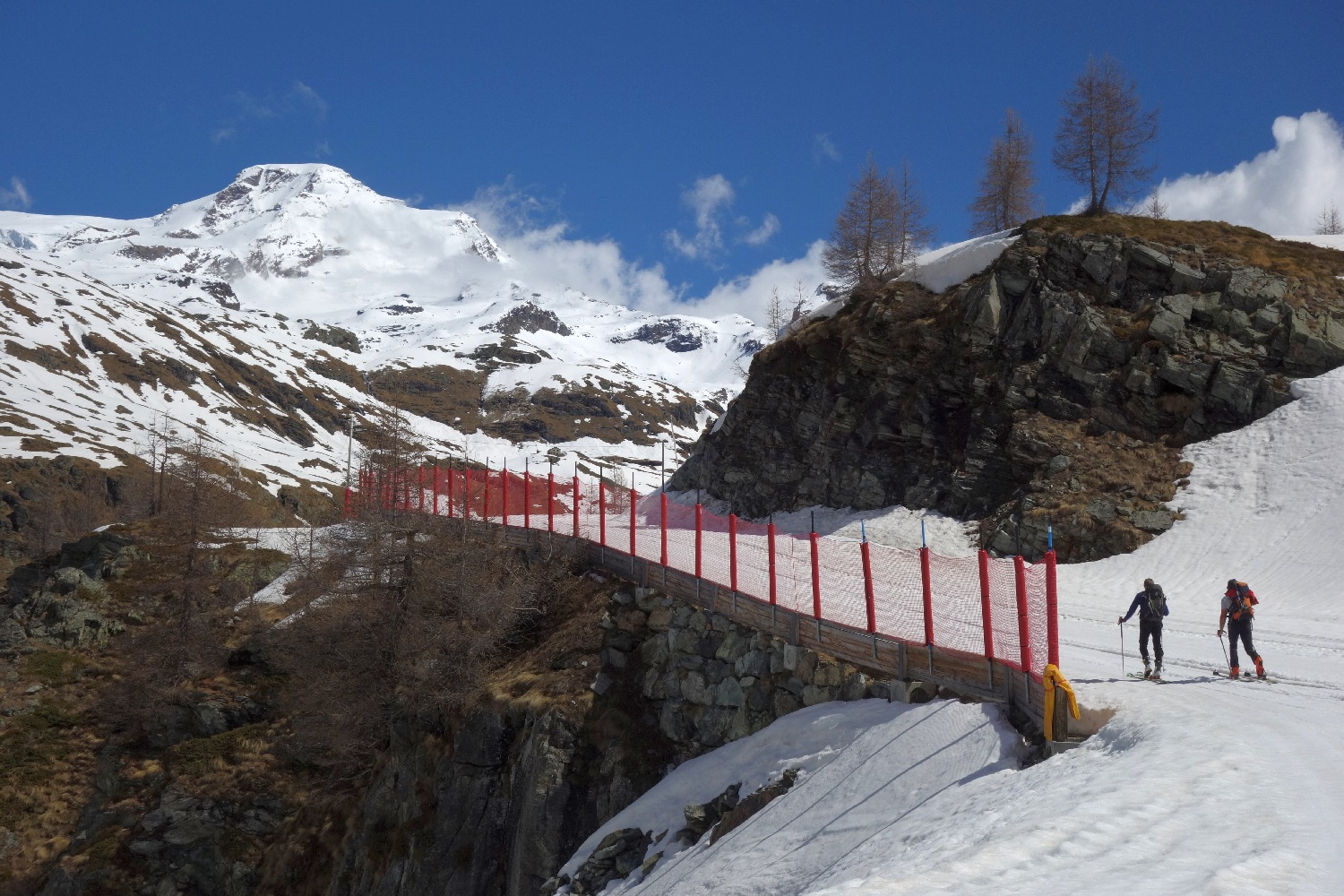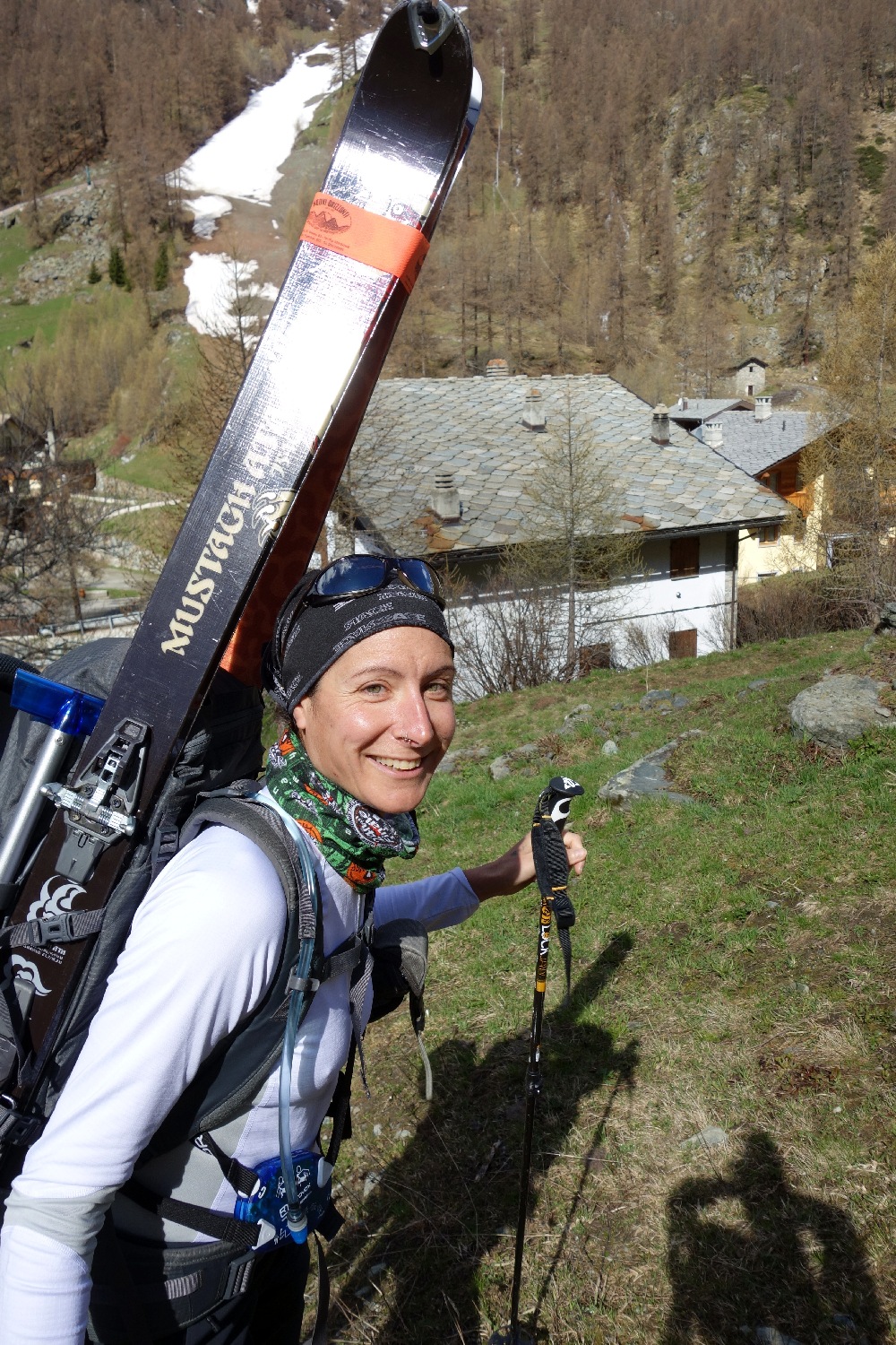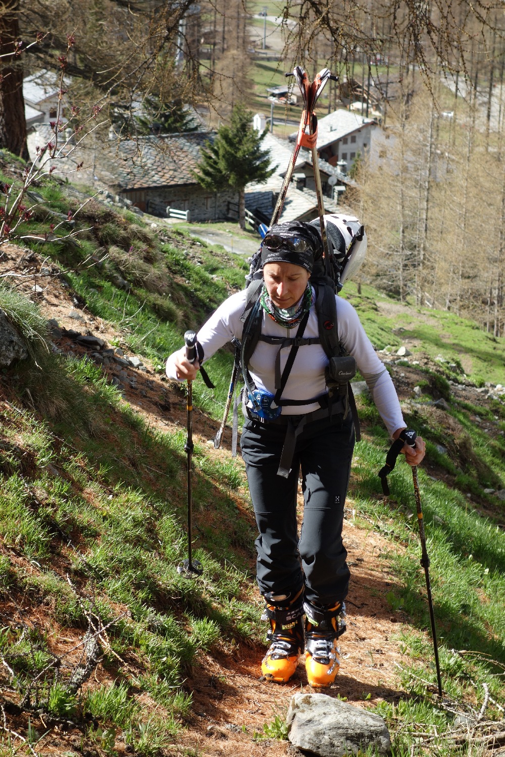 Il nostro sguardo è rivolto a loro, pensiamo alla faticata che ci spetta! ben 1700 metri di dislivello, divertenti per loro, massacranti per noi purtroppo. Ancora più demoralizzante è il fatto che la neve non sembra partire dalla valle e quindi con profonda tristezza, e invidia ci incamminiamo, sci in spalla, verso la nostra meta.