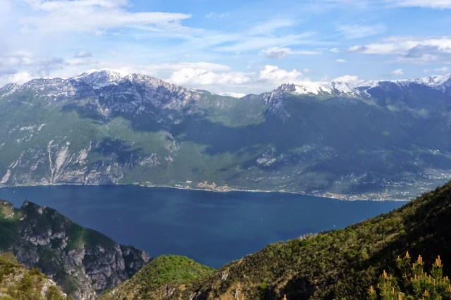 Sostiamo in un punto panoramico per riunire il gruppo, tutti sono entusiasti, nessun lamento, neanche un segno di sofferenza sfiora i nostri visi, solo sorrisi e complimenti per le fatiche superate. Il lago di Garda è sotto di noi, abbracciato da una fantastica cornice, il candido gruppo del Baldo.