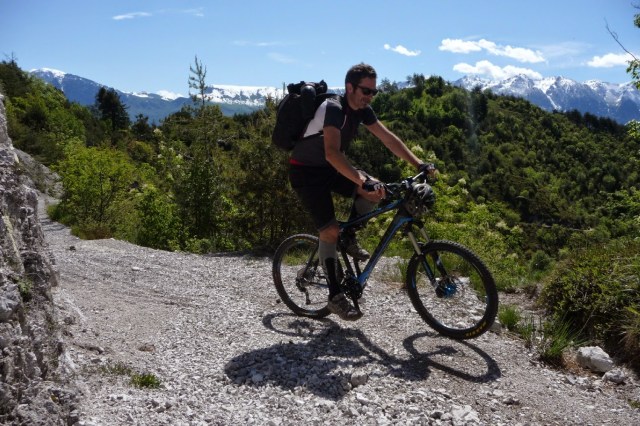 Partiamo un pò timorosi, il sentiero come un trampolino sembra lanciarci direttamente sul lago. Dopo qualche curva al limite del cappottamento il sentiero entra in un canale di ghiaia e sassi smossi. Rinunciamo a guidare, lasciamo semplicemente che la pendenza ci porti giù, siamo in balia delle onde di pietrisco.
