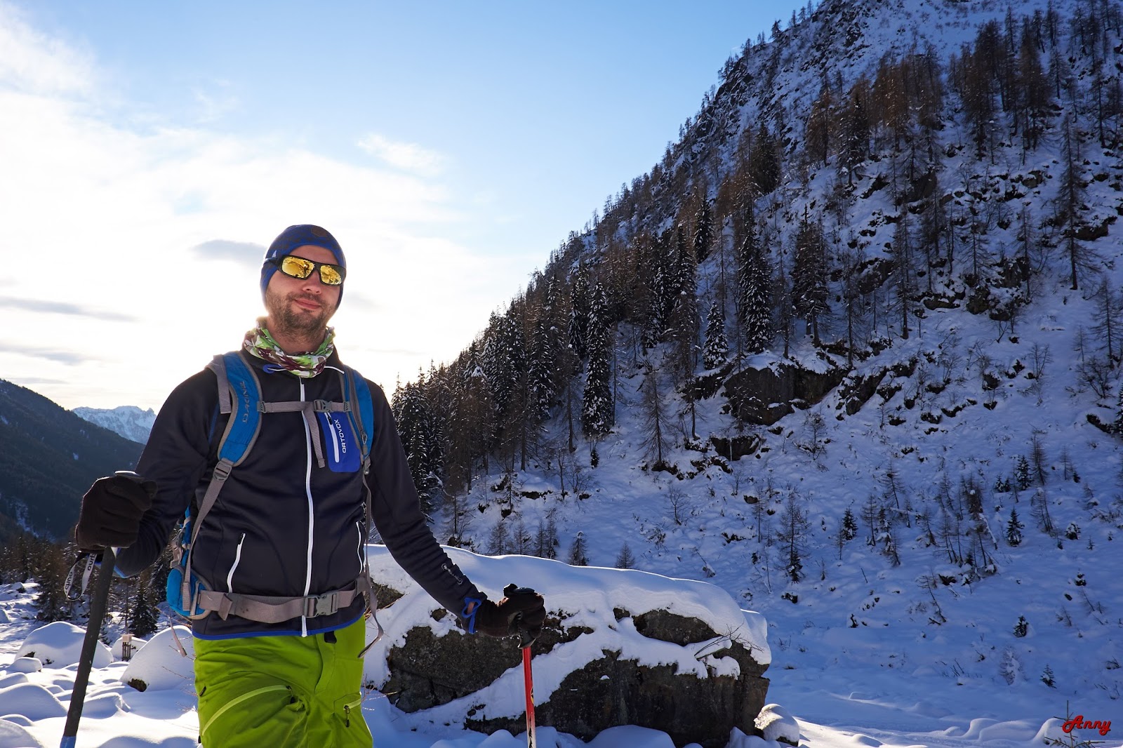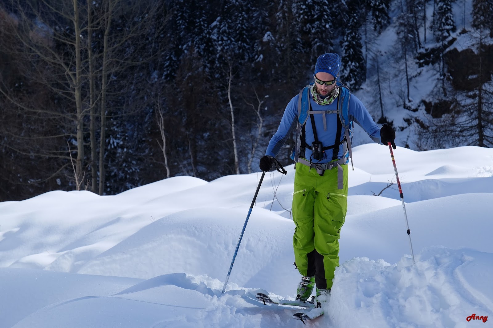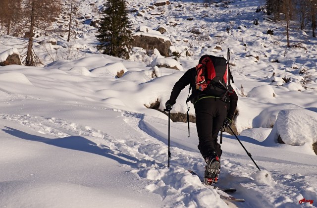 Siamo i tre Moretti’s per eccellenza: io, Dave il top ed Enry. La prima giornata la dedichiamo all’avvicinamento al rifugio e a una piccola gita esporativa per sondare la situazione. Di neve ce ne a sufficienza anche se la grande affluenza di scialpinisti contribuisce ad arare per bene tutti i pendii che scendono dal gettonatissimo Creper Vac. Arrivati quindi al corno de Fus rientriamo prima su neve immacolata e successivamente su un disastro di linee in mezzo al bosco. Il secondo giorno cambiamo completamente programma ed inconsapevolmente affrontiamo la val di Vescovo e il monte Danerba.