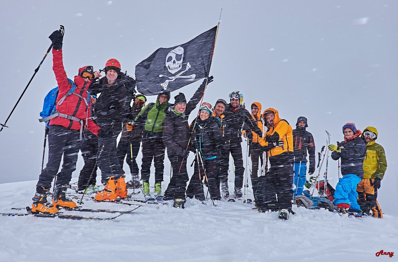 La discesa dal canale della Piella ci chiude leggermente il cervello, i gruppi si miscelano in base alle diverse velocità e capacità degli sciatori. Tra voli, salti e cappottamenti vari arriviamo tutti sani e salvi anche se qualcuno con qualche acciacco dovuto alle cadute. Al termine della discesa completiamo la didattica con un paio di prove di autosoccorso dove emergono tutte le nostre lacune.