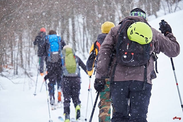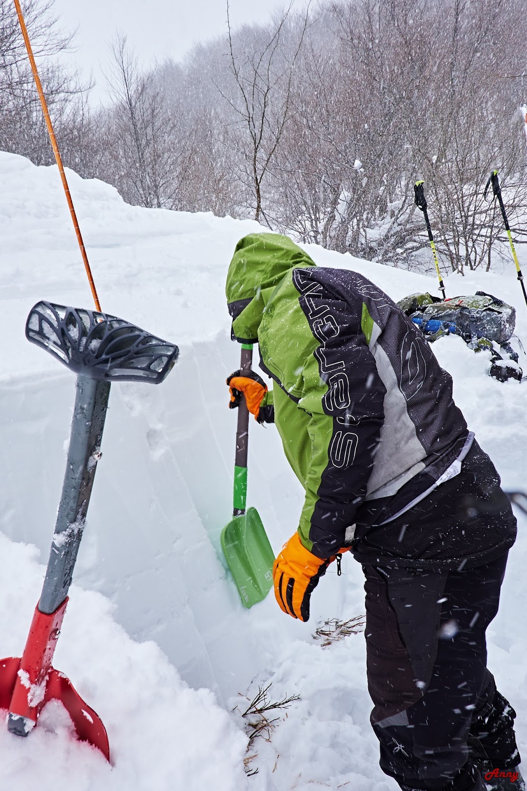Il cielo non promette nulla di buono, ma almeno non piove, meglio non lamentarsi. Passiamo la mattina facendo prove arva, di scavo e una stratigrafia del manto nevoso.