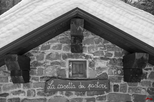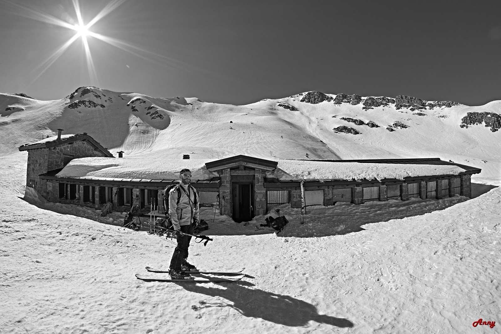 Il lago Nero non è ovviamente visibile sotto la coltre di neve, solo il rifugio ci permette di immaginare la sua posizione.