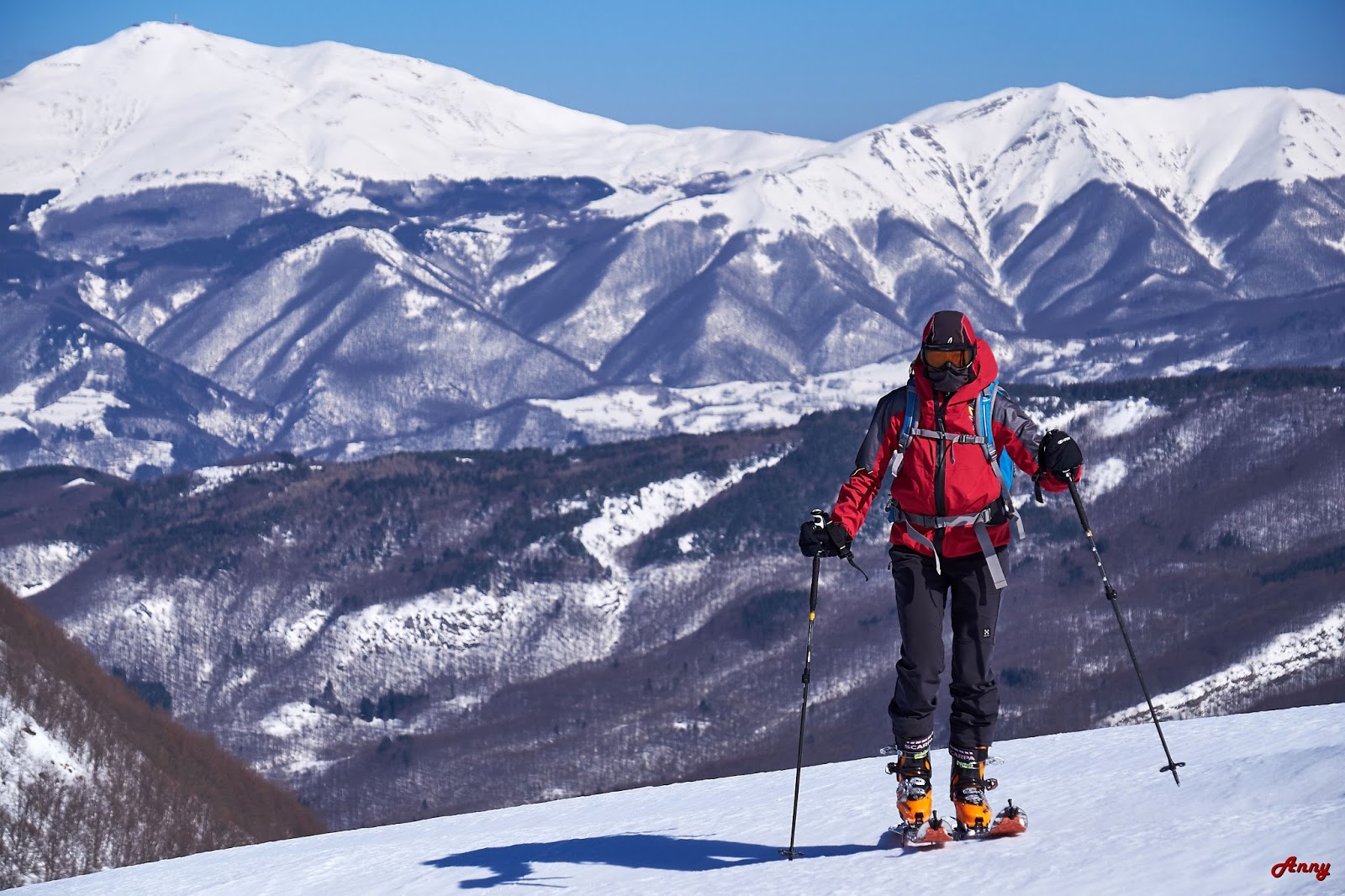 Ad ogni modo arriviamo in poco tempo poco sotto la vetta del Rondinaio. Qui le raffiche ci colpiscono, solide come un muro di cemento. Meglio spellare un minimo riparati e fuggire dalla bufera il prima possibile. La neve è ventata e dura come un sasso, tipica situazione del nostro appennino, non c’è quindi da preoccuparsi.