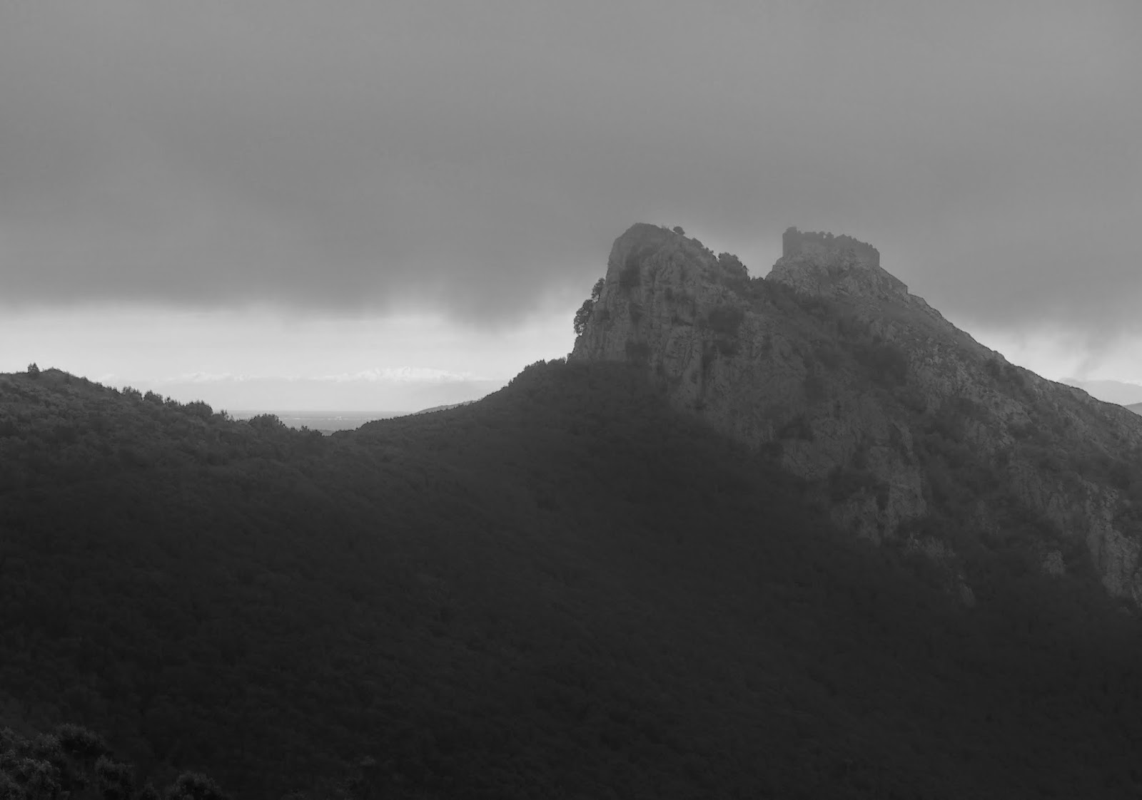 Rocca su di un cocuzzolo, e sullo sfondo le montagne innevate della Corsica: